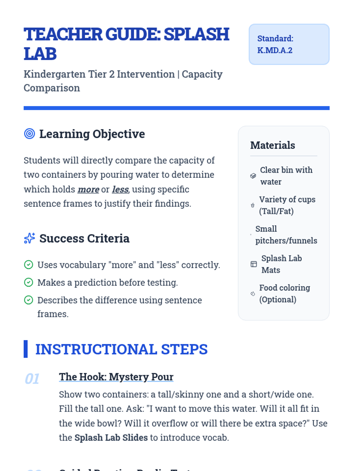A comprehensive teacher guide for a Tier 2 intervention lesson on capacity, including lesson steps, success criteria, and a progress monitoring checklist.