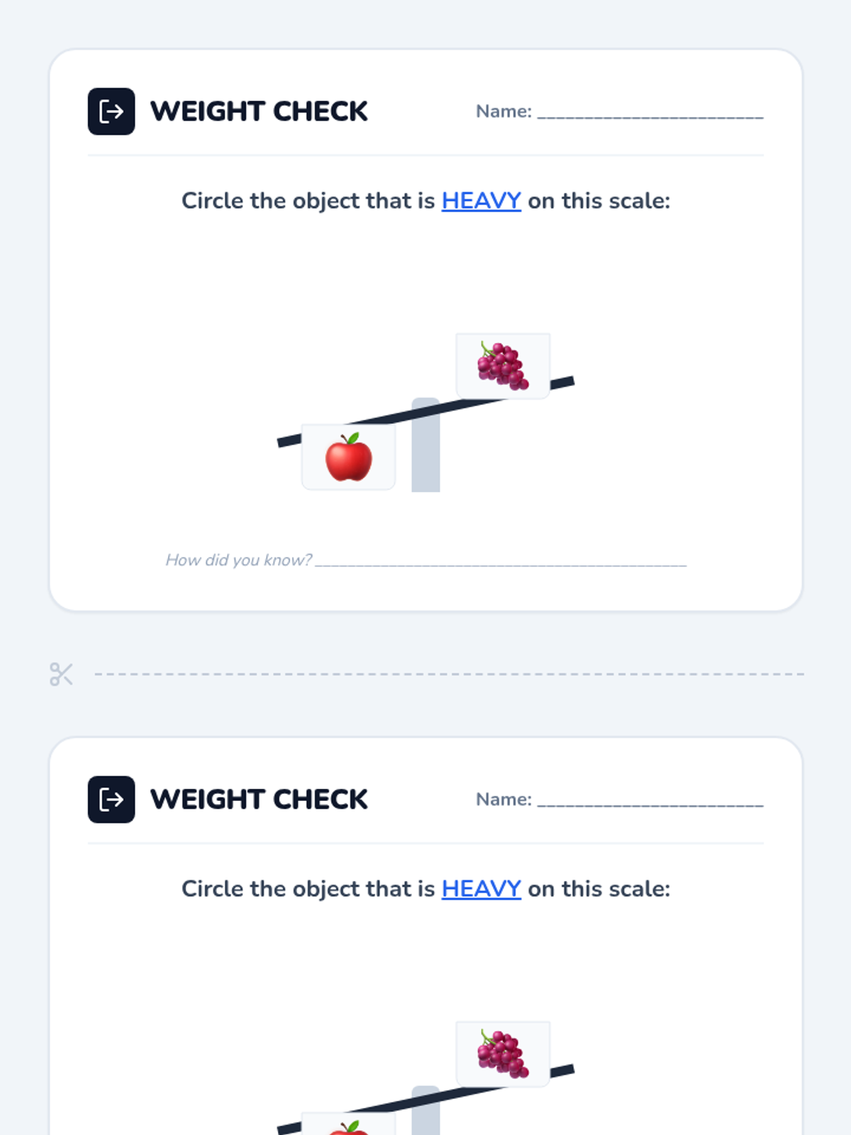 A quick-check assessment (exit ticket) with two per page. Features a scale visual where students identify the heavier object and provide a brief explanation.