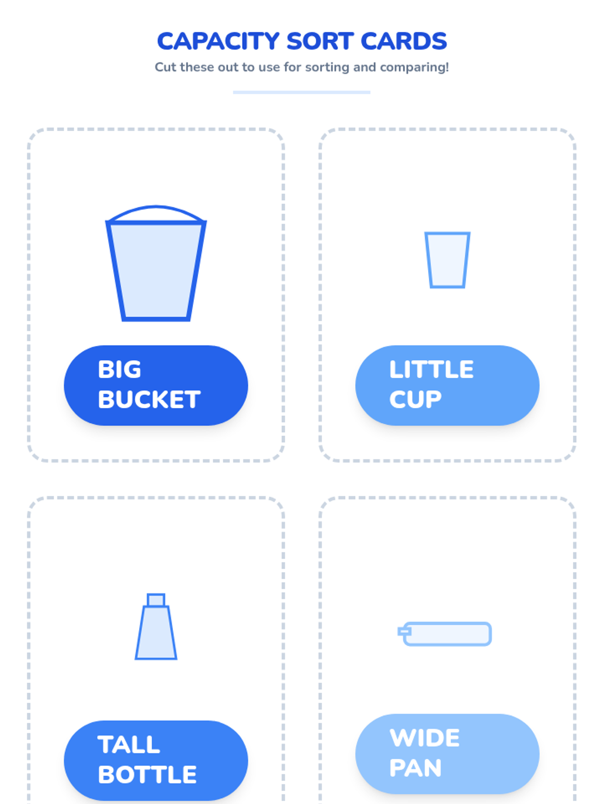 Visual capacity cards for sorting and direct comparison activities, featuring various container shapes like buckets, bottles, and pans.