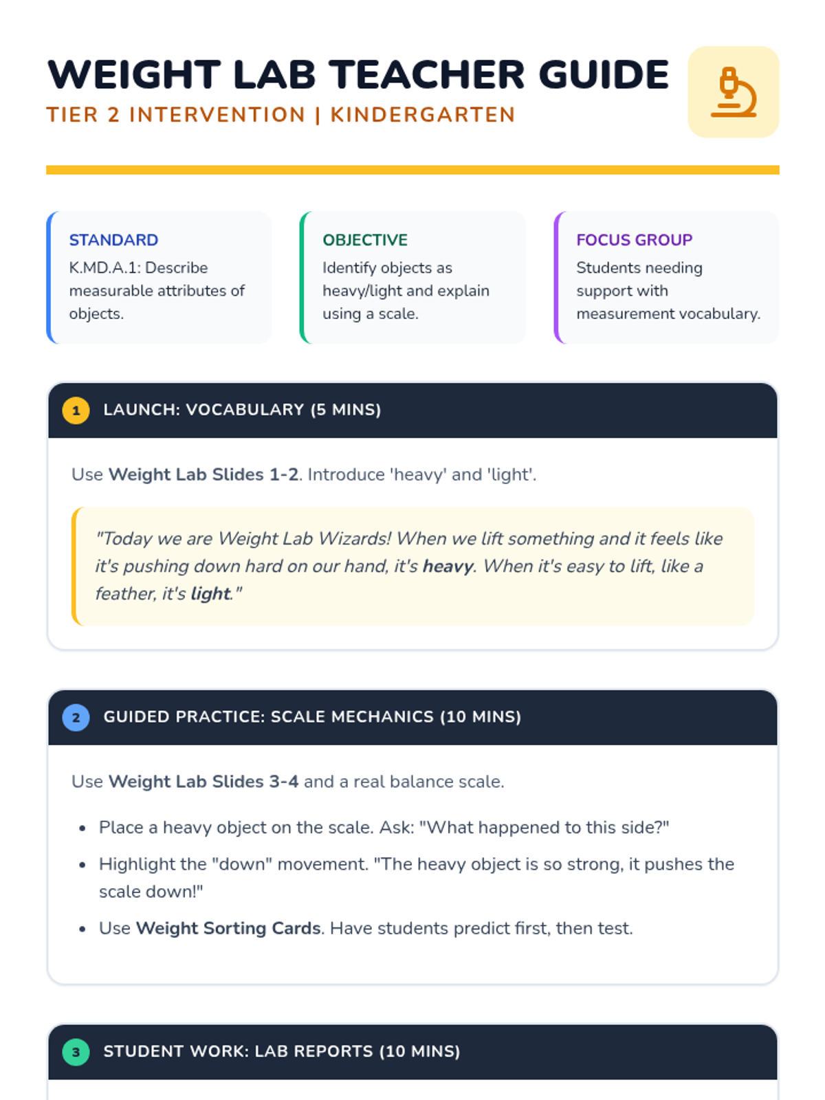 A comprehensive teacher guide for leading a Tier 2 small group intervention on weight. Includes scripted prompts, a structured lesson flow, and a progress monitoring checklist for four students.