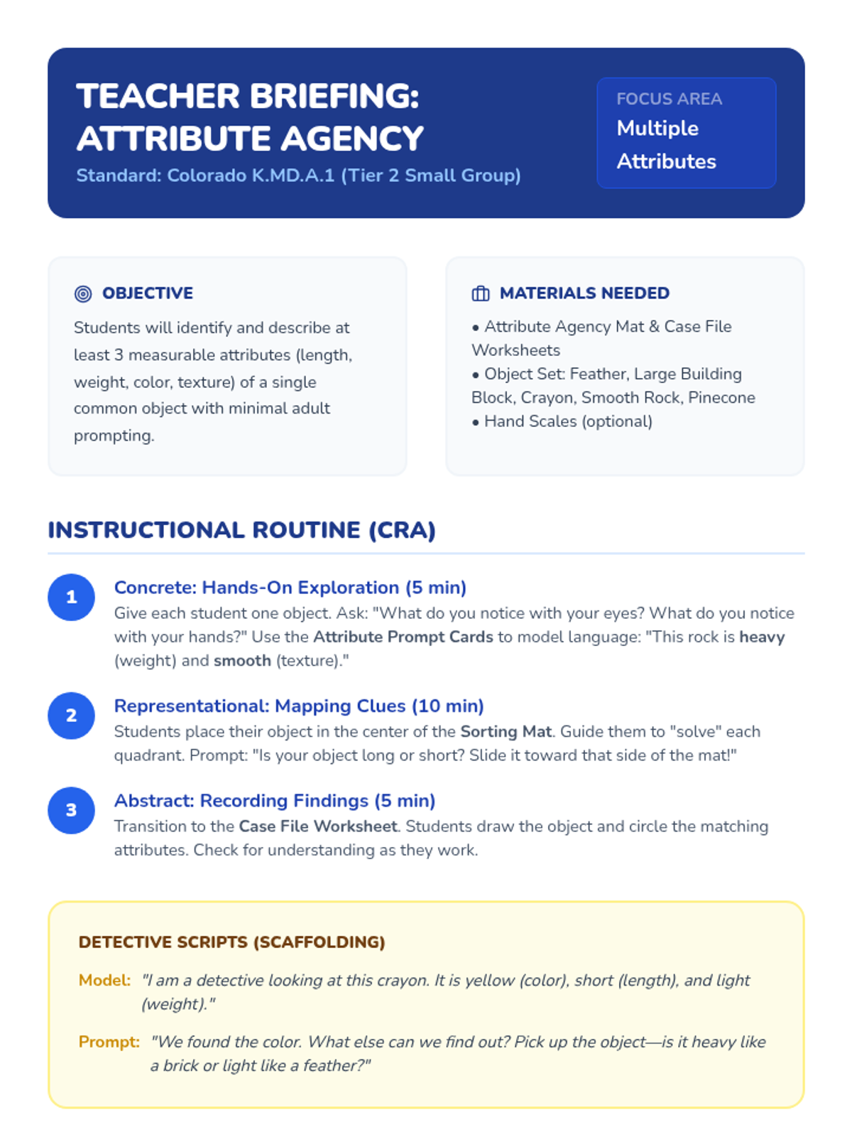 A comprehensive teacher's guide for the intervention, including objective, materials, a three-step CRA routine, scripted prompts, and a progress monitoring rubric.