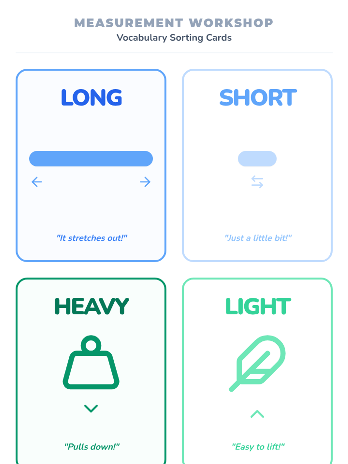 Large-format vocabulary cards for "Long", "Short", "Heavy", and "Light" designed for sorting activities and visual support in a Kindergarten measurement intervention.