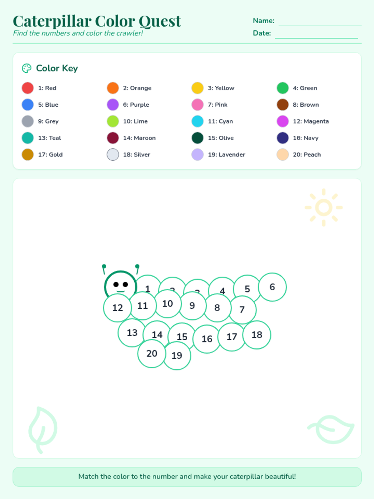 A revised single-page color-by-number worksheet with an improved winding caterpillar layout, sequential numbering, and clearer color swatches.