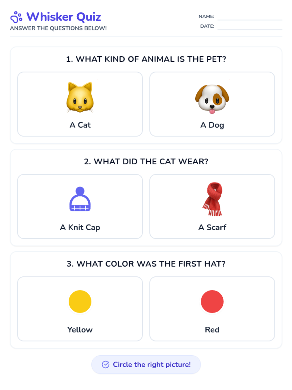 A updated comprehension quiz where Question 3 specifically asks, "What color was the first hat?". Contains visual choices for three simple questions.