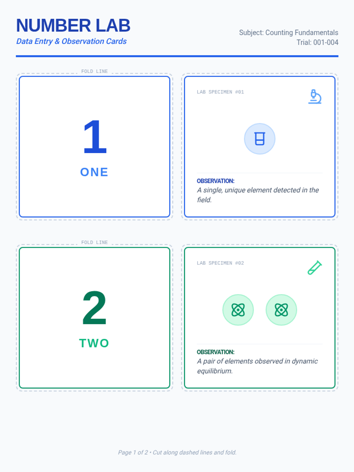 An expanded laboratory-themed set of flashcards for the numbers one through four, featuring numerals, words, and scientific icons across two pages.