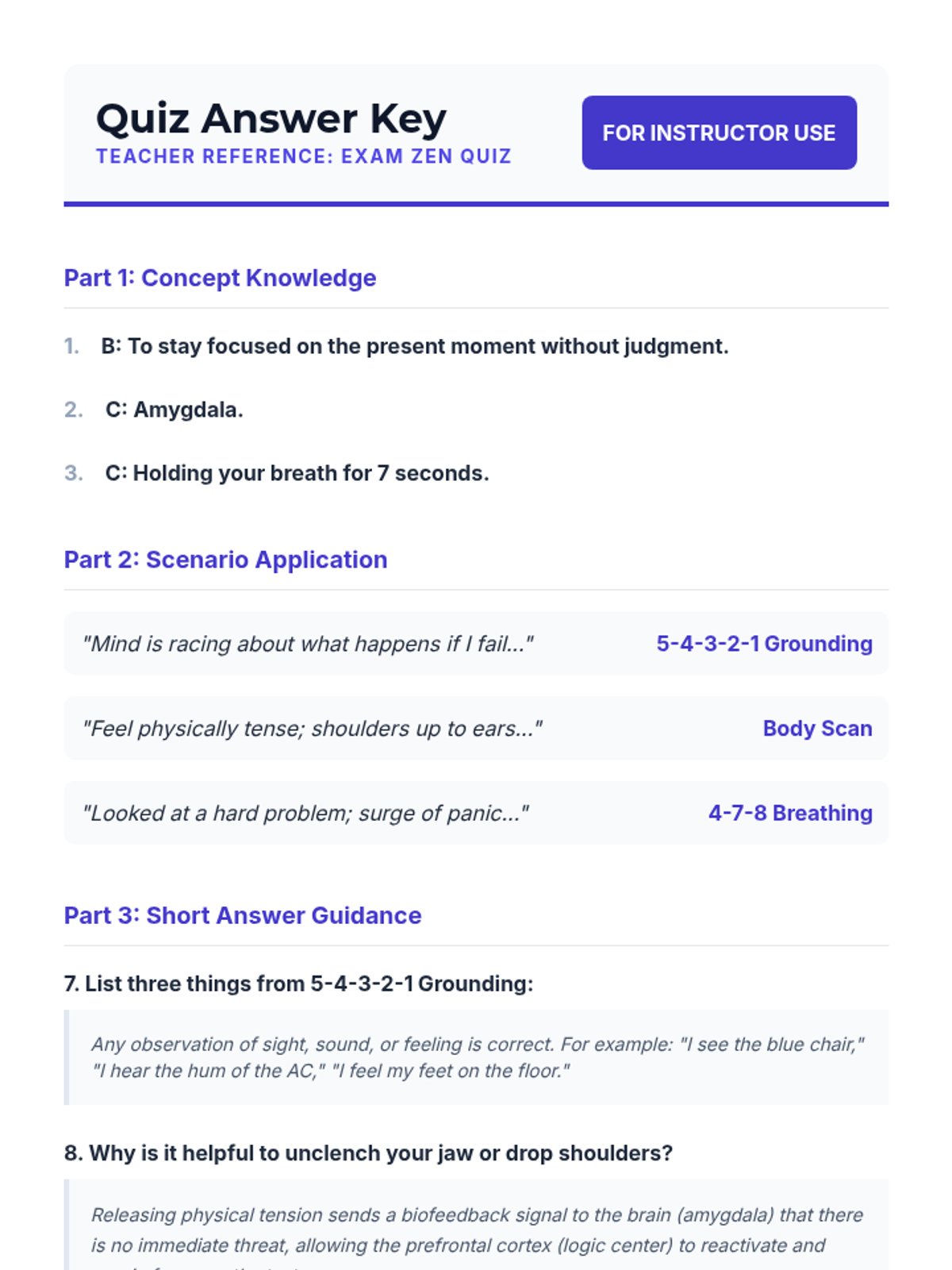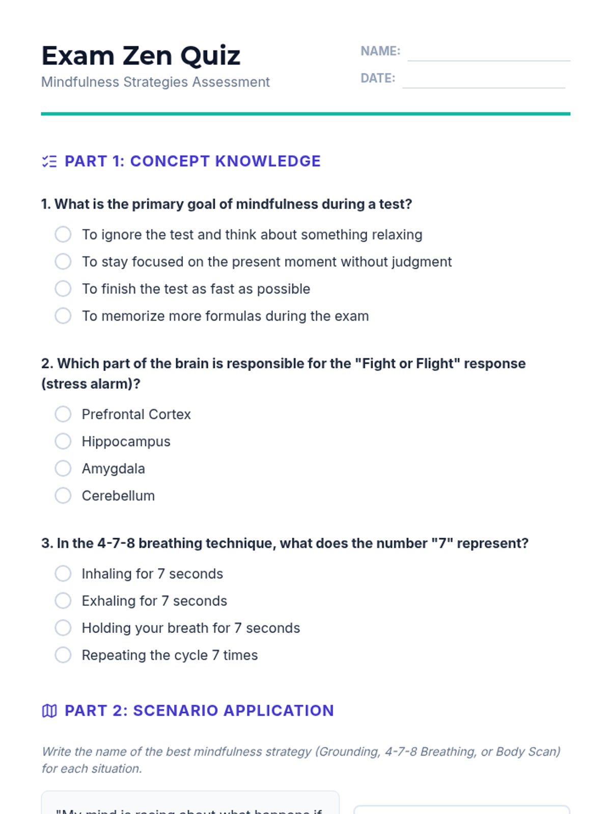 A quick assessment for students to complete at the end of the lesson. It focuses on the contrasting roles of the Amygdala and Prefrontal Cortex, the goal of cognitive restructuring, and the necessity of exposure therapy.