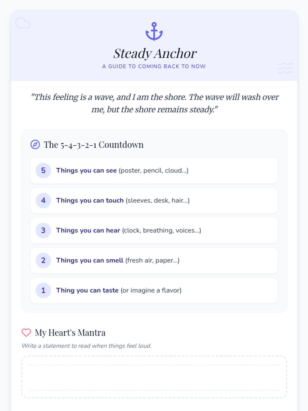 Grounding TechniquesSensory engagement, cognitive distractions, and breathing exercises to manage acute anxiety or dissociation. Builds skills for redirecting focus to the immediate physical environment during moments of distress.