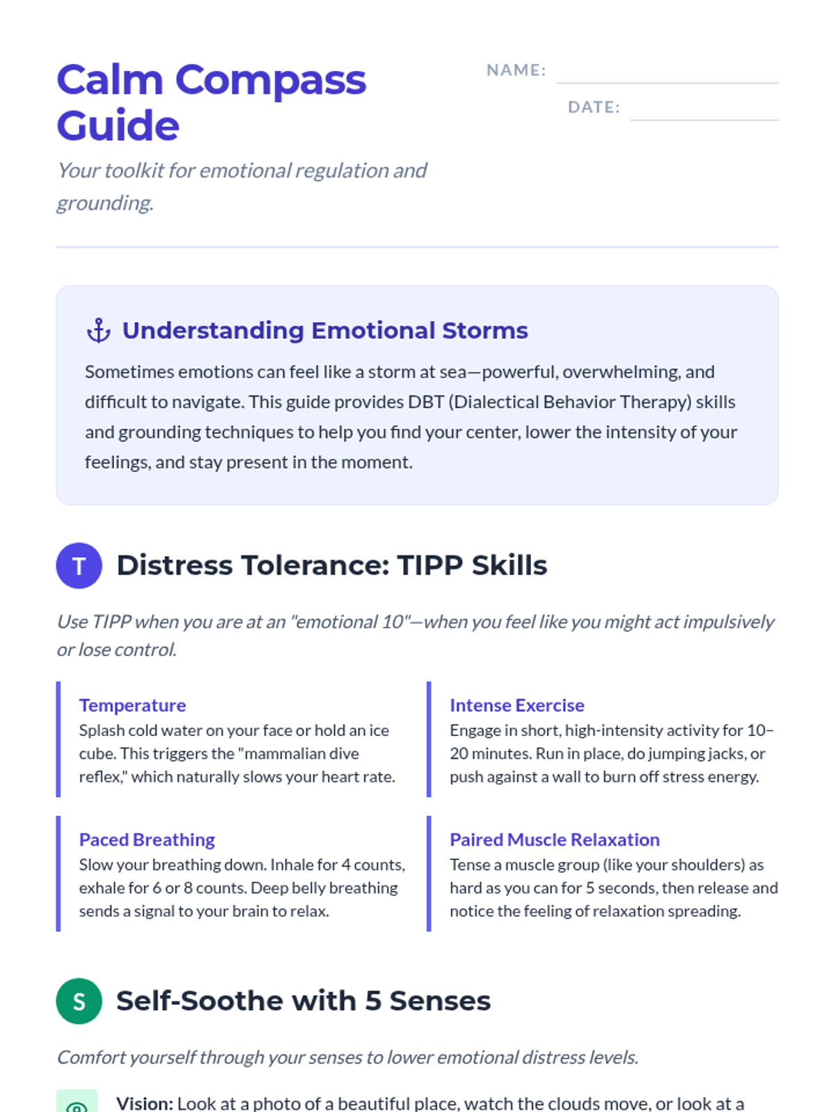 Self-Soothing & DistractionSensory-based grounding techniques and distress tolerance strategies for immediate emotional regulation. Equips individuals with mindfulness practices and constructive diversions to manage intense psychological triggers.