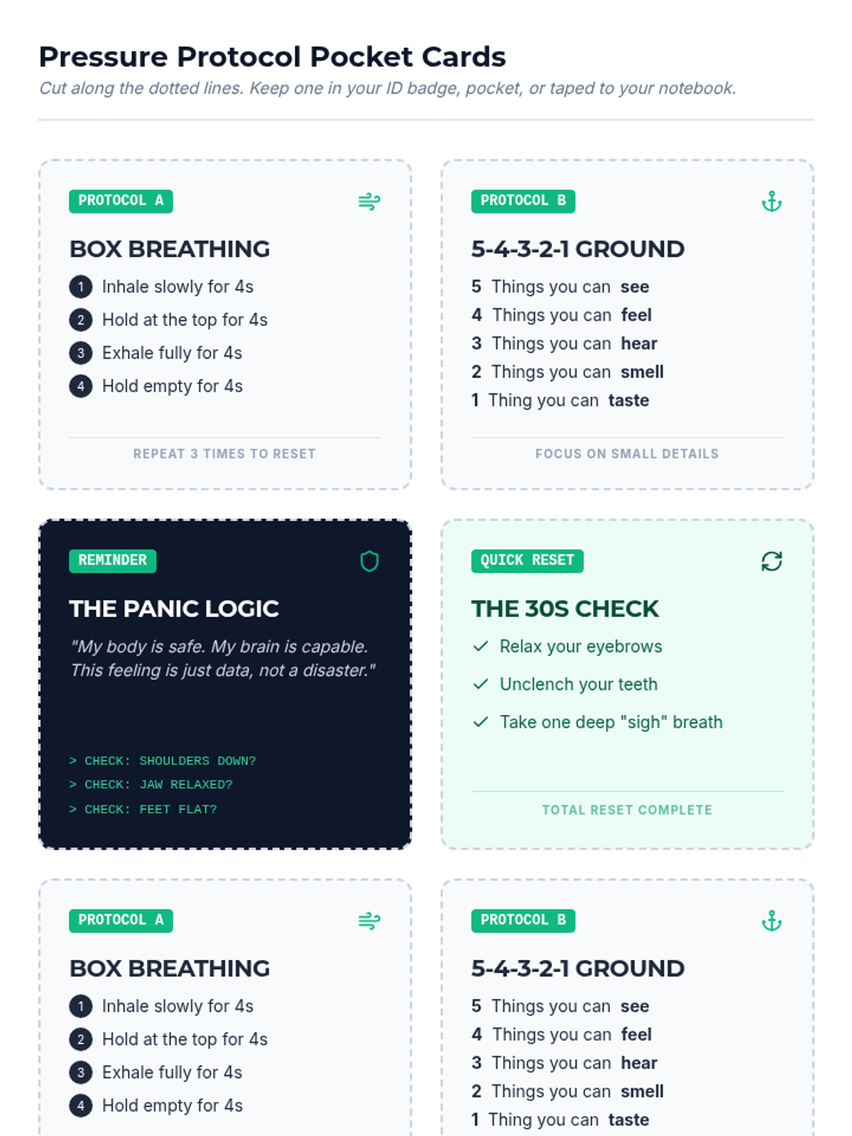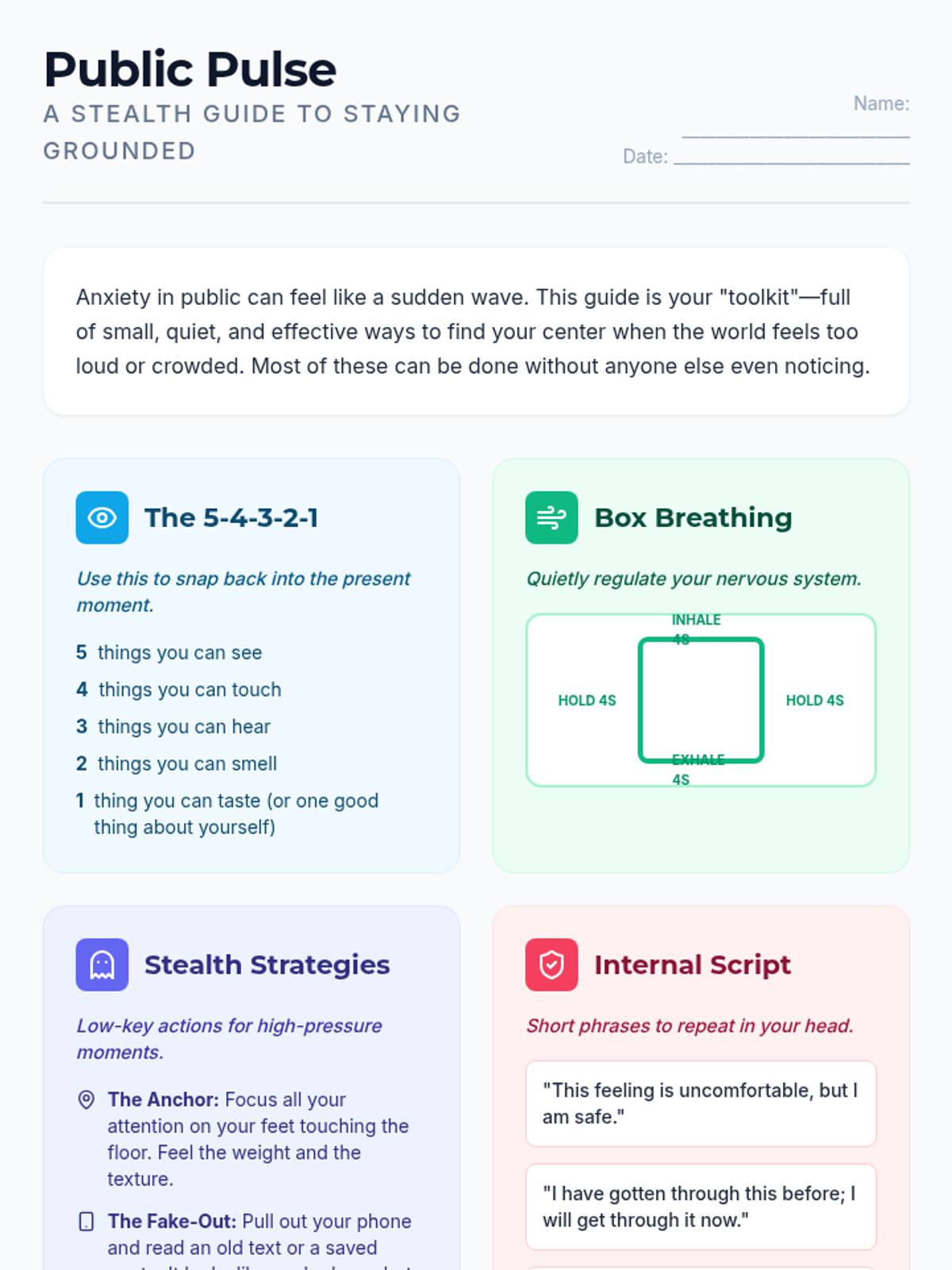 A compact grounding reference sheet featuring the 5-4-3-2-1 technique, square breathing visual, a mantra writing area, and a "Just 5 Minutes" challenge. Designed to fit easily on a single page for quick student reference.