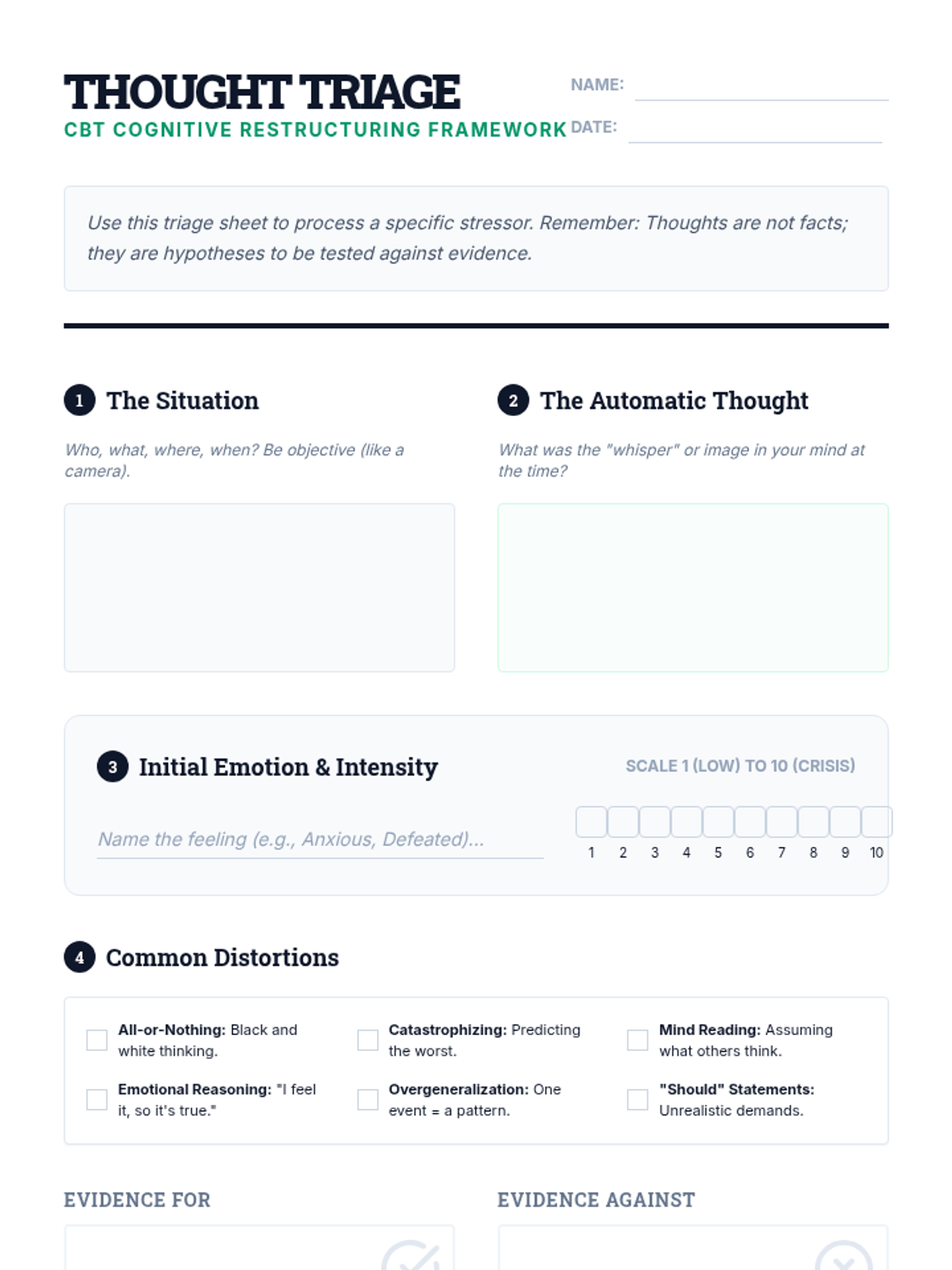 Thought Record TrackingCognitive restructuring techniques for identifying, challenging, and reframing automatic negative thoughts. Equips practitioners with tools to document evidence and evaluate the accuracy of cognitive distortions.