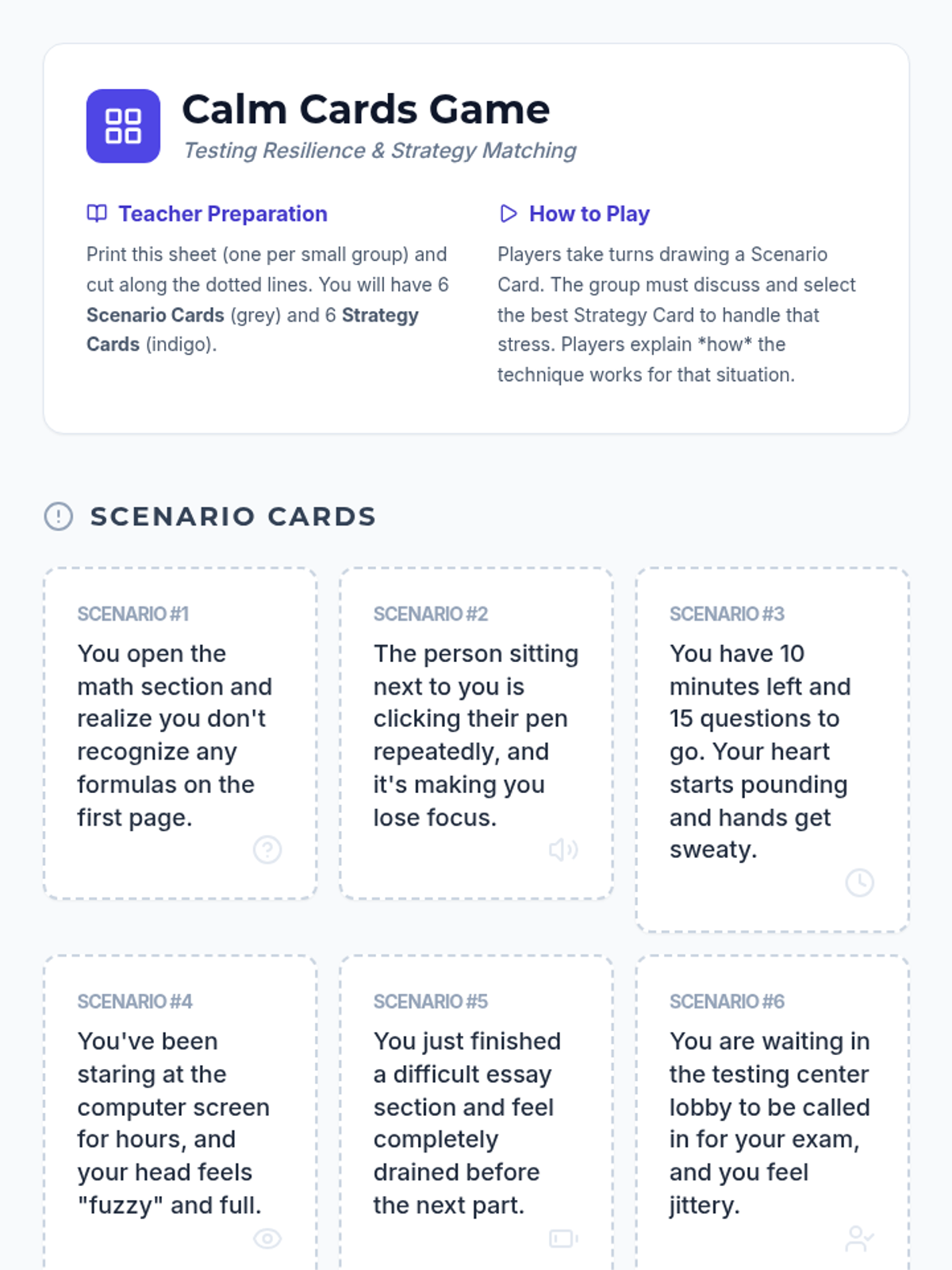 A set of high-stakes, realistic scenario cards for practice and role-play in a conflict resolution lesson. Each card identifies a specific conflict type (disrespect, accusations, etc.) and provides a de-escalation challenge for students to solve.