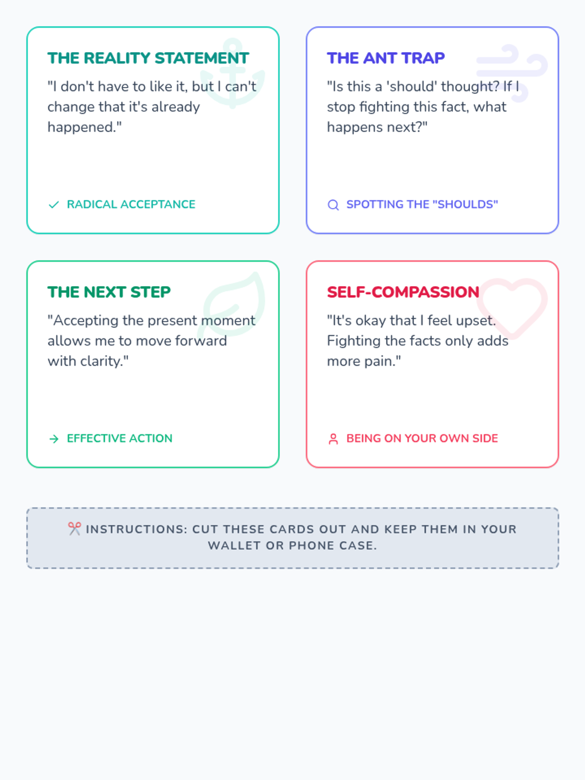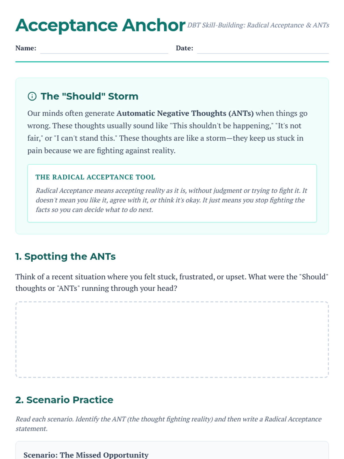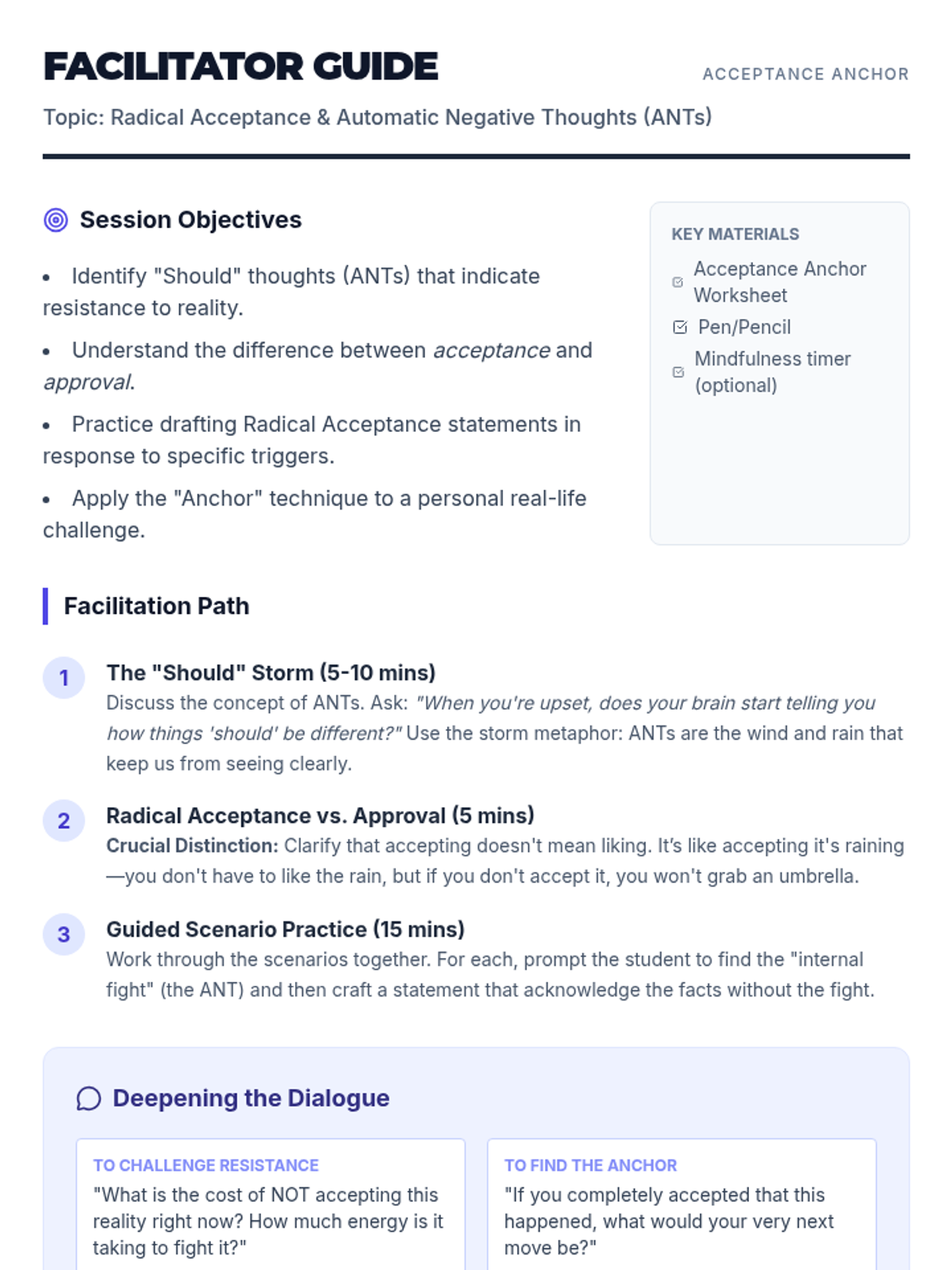 Radical Acceptance PracticeTechniques for acknowledging reality without judgment to reduce emotional suffering and psychological resistance. Develops distress tolerance skills through mindfulness, cognitive reframing, and acceptance-based coping strategies.