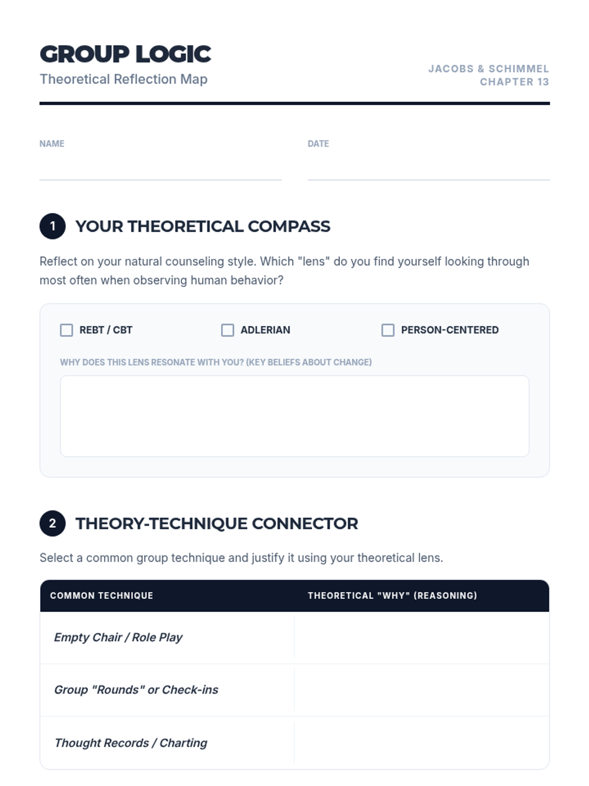 A student-facing planning worksheet for selecting, designing, and preparing to lead a group counseling exercise based on Jacobs et al. framework. Updated with white work areas for improved legibility.