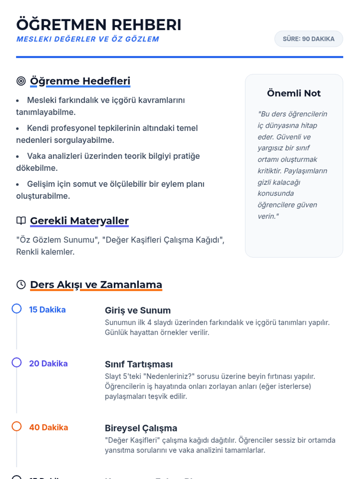 Öğretmenlerin mesleki farkındalık ve içgörü dersini etkili bir şekilde işlemesi için tasarlanmış; süre yönetimi, tartışma soruları ve uygulama ipuçlarını içeren kapsamlı rehber.