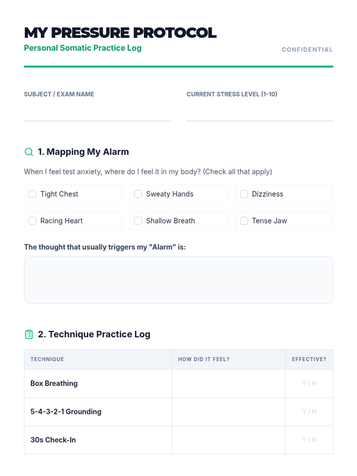 Identifying Trauma FeelingsRecognition of emotional and physiological signatures associated with traumatic experiences. Targets awareness of triggers, somatic markers, and the distinction between past reactions and present safety.