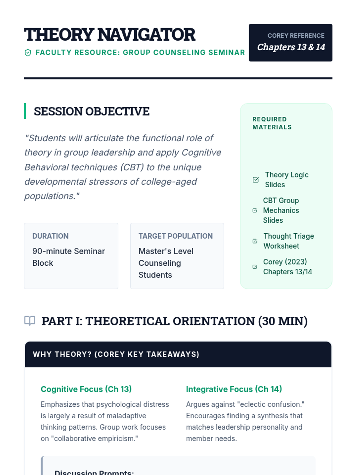 A professional facilitation guide for instructors, detailing the 2-hour seminar timeline, instructional sequence for Chapters 10 and 11, and clinical tips for supervising student share-outs.