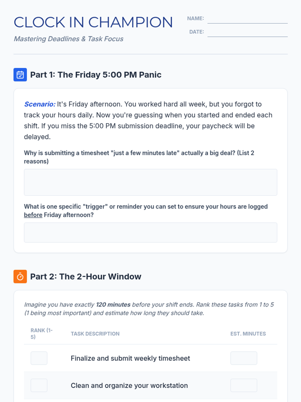 A focused 10-15 minute worksheet for students or employees to practice timesheet compliance and task prioritization. It includes a scenario-based problem, a ranking activity for a 120-minute window, and a personal commitment section.