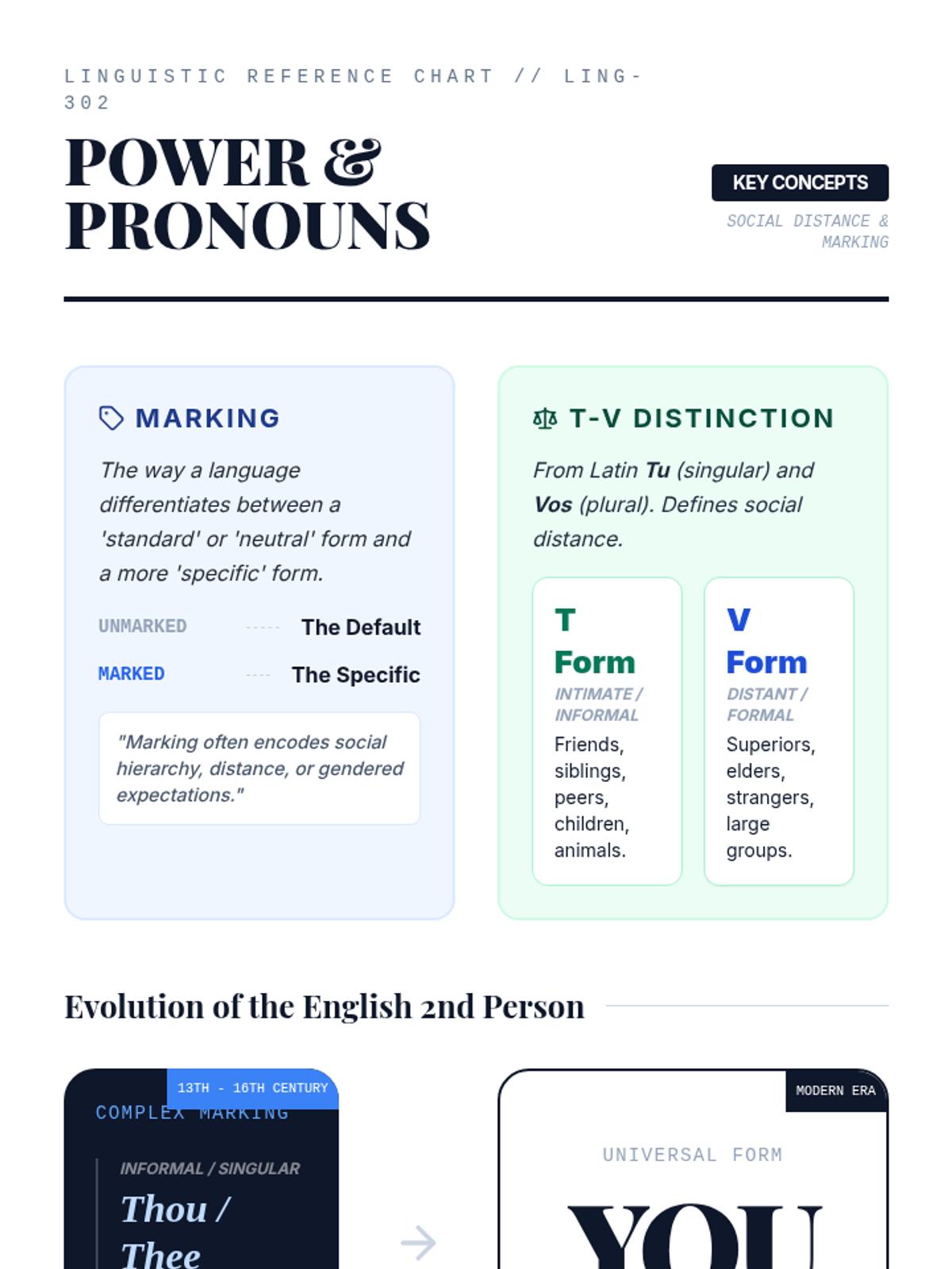 An academic-style anchor chart for 11th-12th grade linguistics students. It visually defines 'Marking' and the 'T-V Distinction', illustrates the historical evolution of English second-person pronouns, and draws parallels between the historical 'You' shift and the modern 'Singular They' movement.