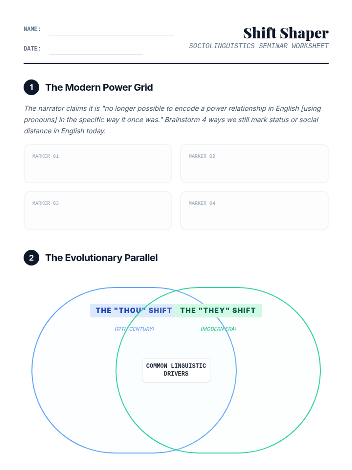 A seminar-style student worksheet to accompany the 'Power and Pronouns' lesson. Features sections for brainstorming modern power markers, a large Venn Diagram for comparing historical and modern pronoun shifts, and a final quick-write reflection area.