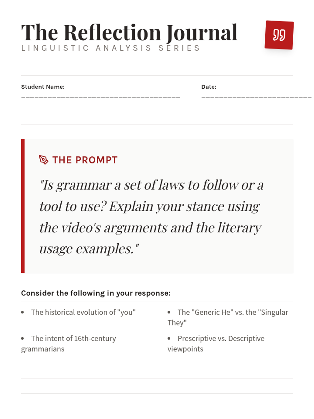A dedicated journal entry page for student reflection. Features the central prompt about grammar as a 'law vs. tool' and provides a structured, aesthetic workspace for a formal written response.