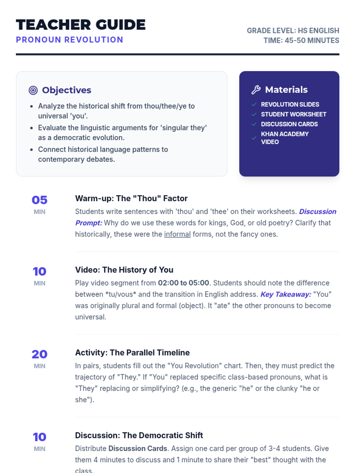 A comprehensive teacher guide for the Pronoun Revolution lesson. Includes a detailed lesson plan with pacing, key takeaways for the video and activity, and a 'Linguistic Cheat Sheet' to help facilitate class discussions.