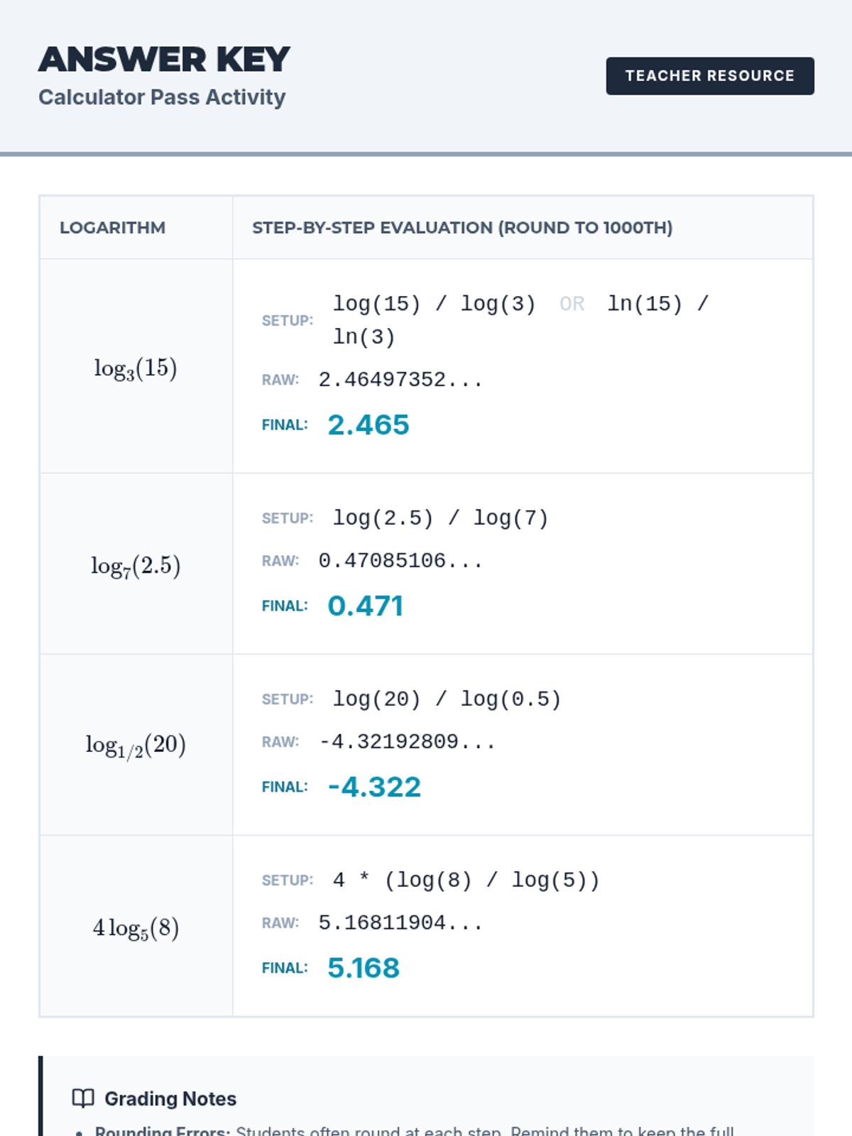 Answer key for the Calculator Pass Worksheet, providing raw decimals, rounded answers, and common student error alerts for teachers.