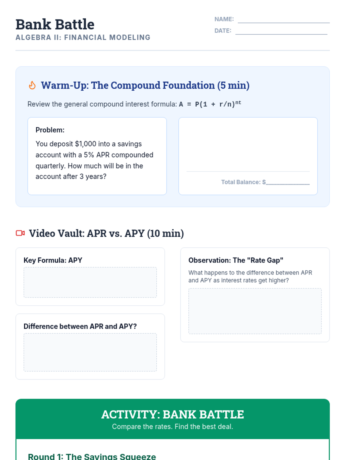 A comprehensive student worksheet for the Bank Battle activity, including warm-up exercises, video note sections, and two-round financial scenarios comparing banks for savings and loans. Revisions made for clarity and spacing.