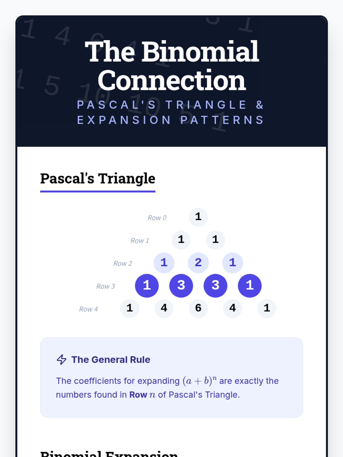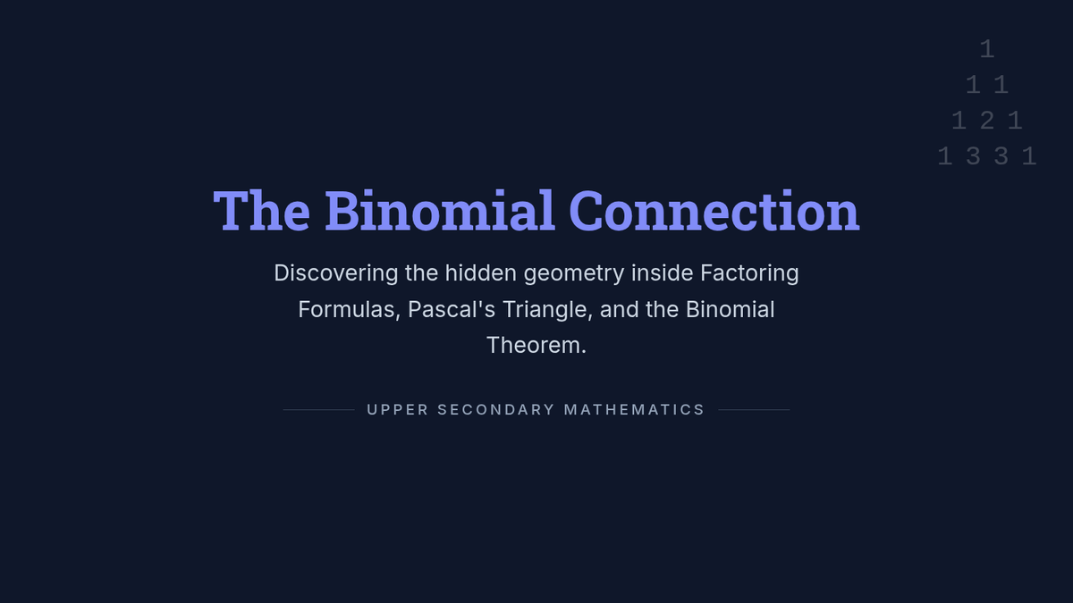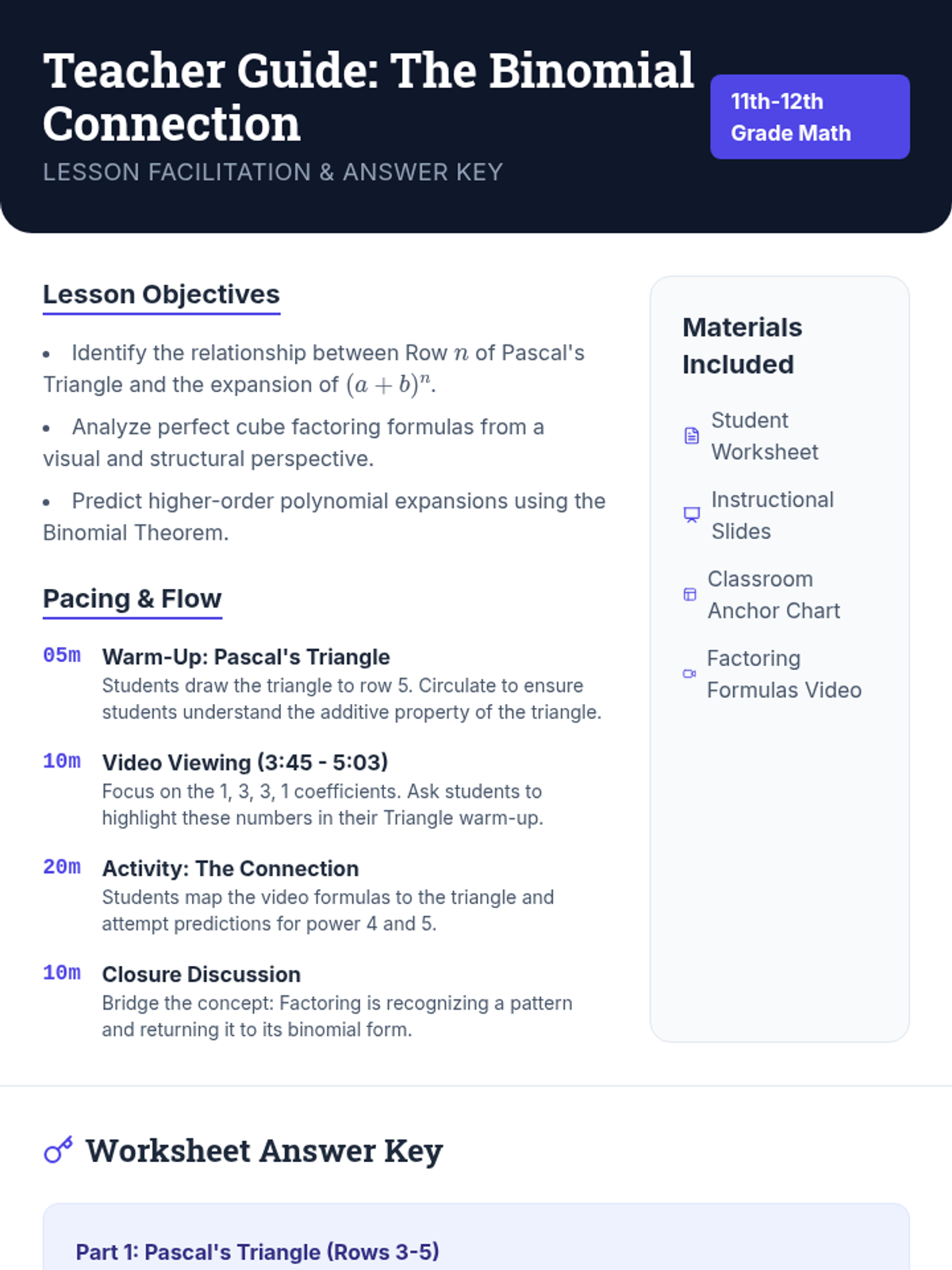 A teacher guide for 'The Binomial Connection' lesson. Includes pacing guide, pedagogical tips for connecting factoring to Pascal's Triangle, and a complete answer key for the student worksheet.