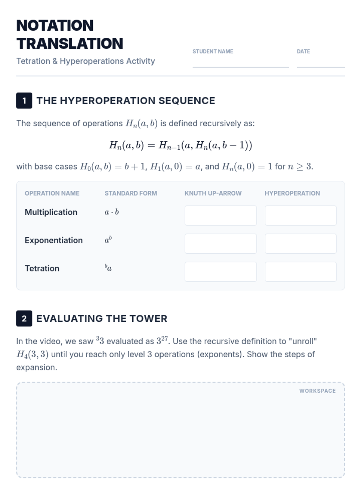 A technical worksheet for undergraduate math students to practice translating between tetration notations, verifying recursive definitions, and solving equations involving super roots.