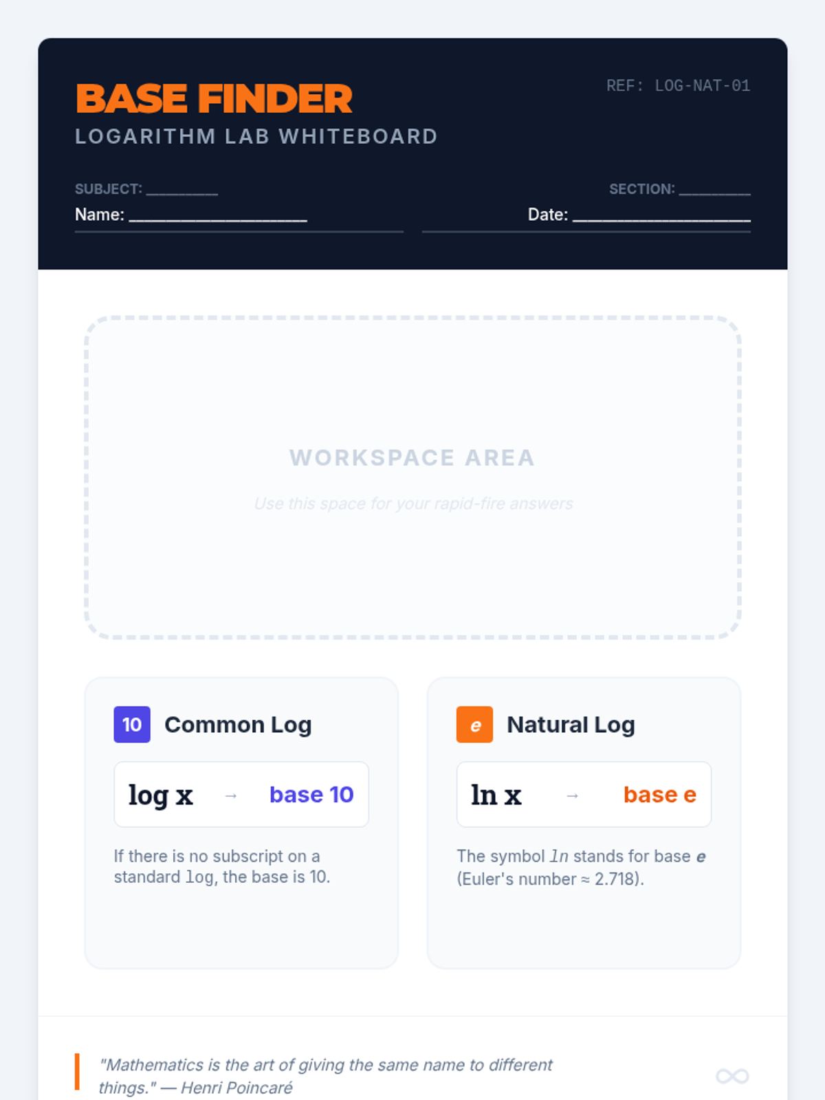 A printable whiteboard template and reference sheet for students to use during the 'Spot the Base' activity. It provides a large workspace and quick-glance definitions for common and natural logarithms.