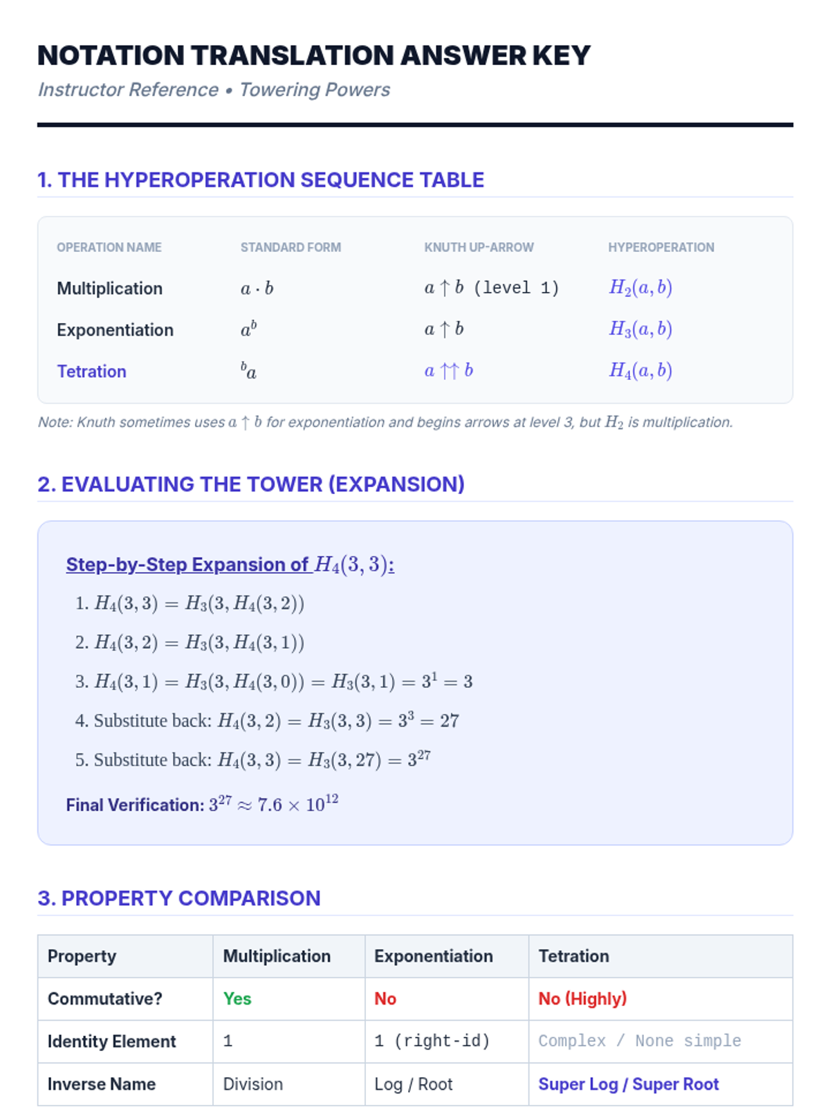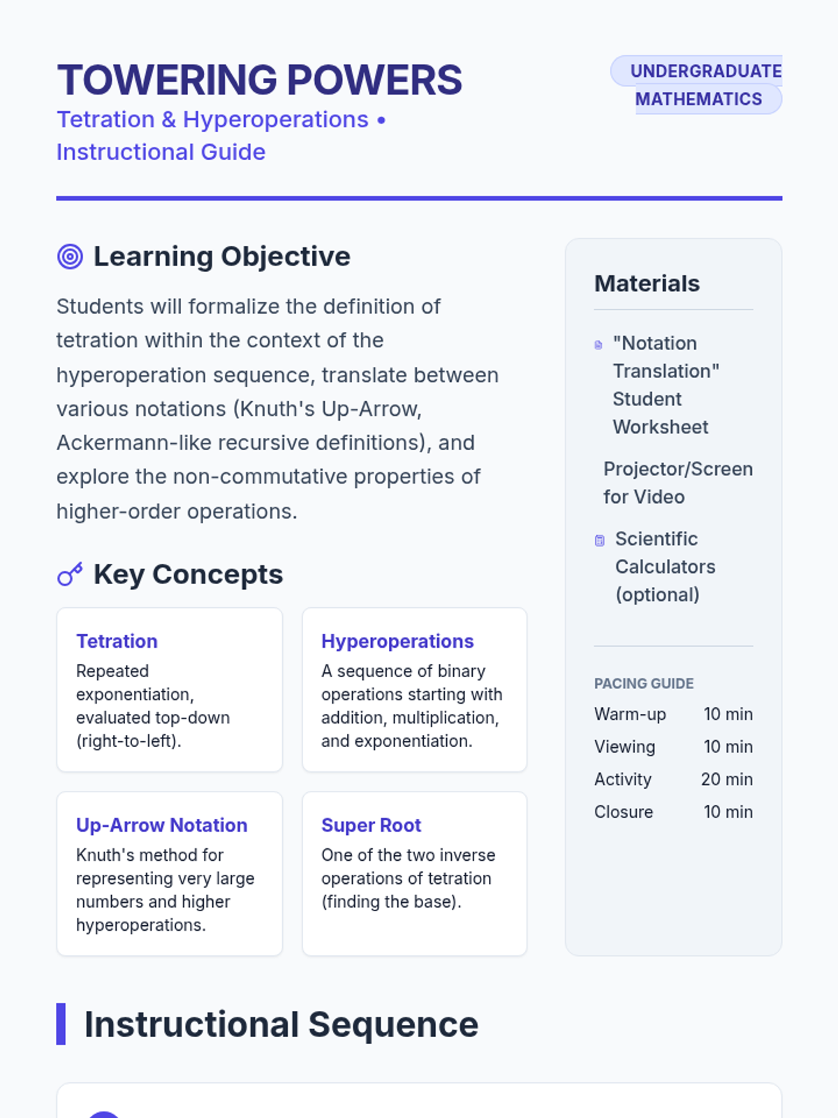A comprehensive teacher's lesson plan for teaching tetration and hyperoperations to undergraduate students. Includes pacing, key questions, and pedagogical strategies for integrating the provided video content.
