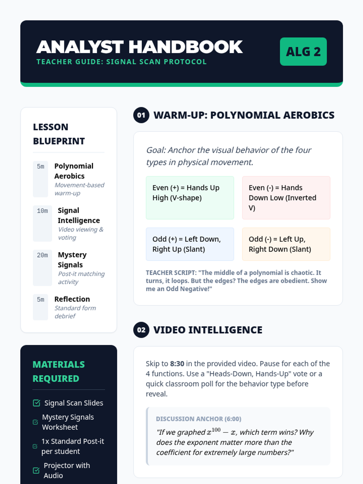 A comprehensive instructional guide for teachers, detailing the lesson timeline, key teaching moments from the video, game rules for 'Logarithm War', and pedagogical strategies for high school math.