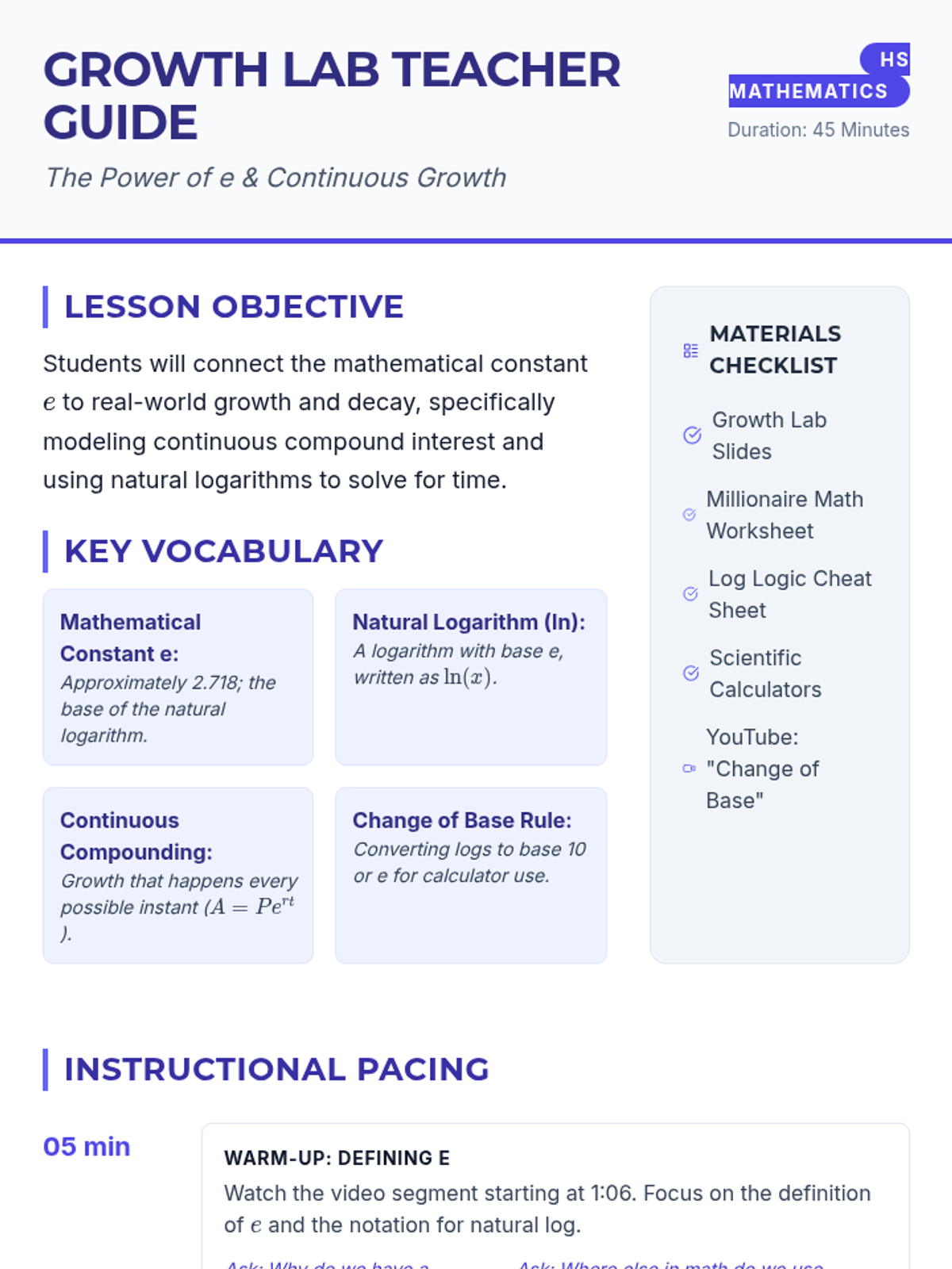 A comprehensive teacher guide for a high school math lesson on the constant e and exponential growth, including pacing, vocabulary, and common student misconceptions.