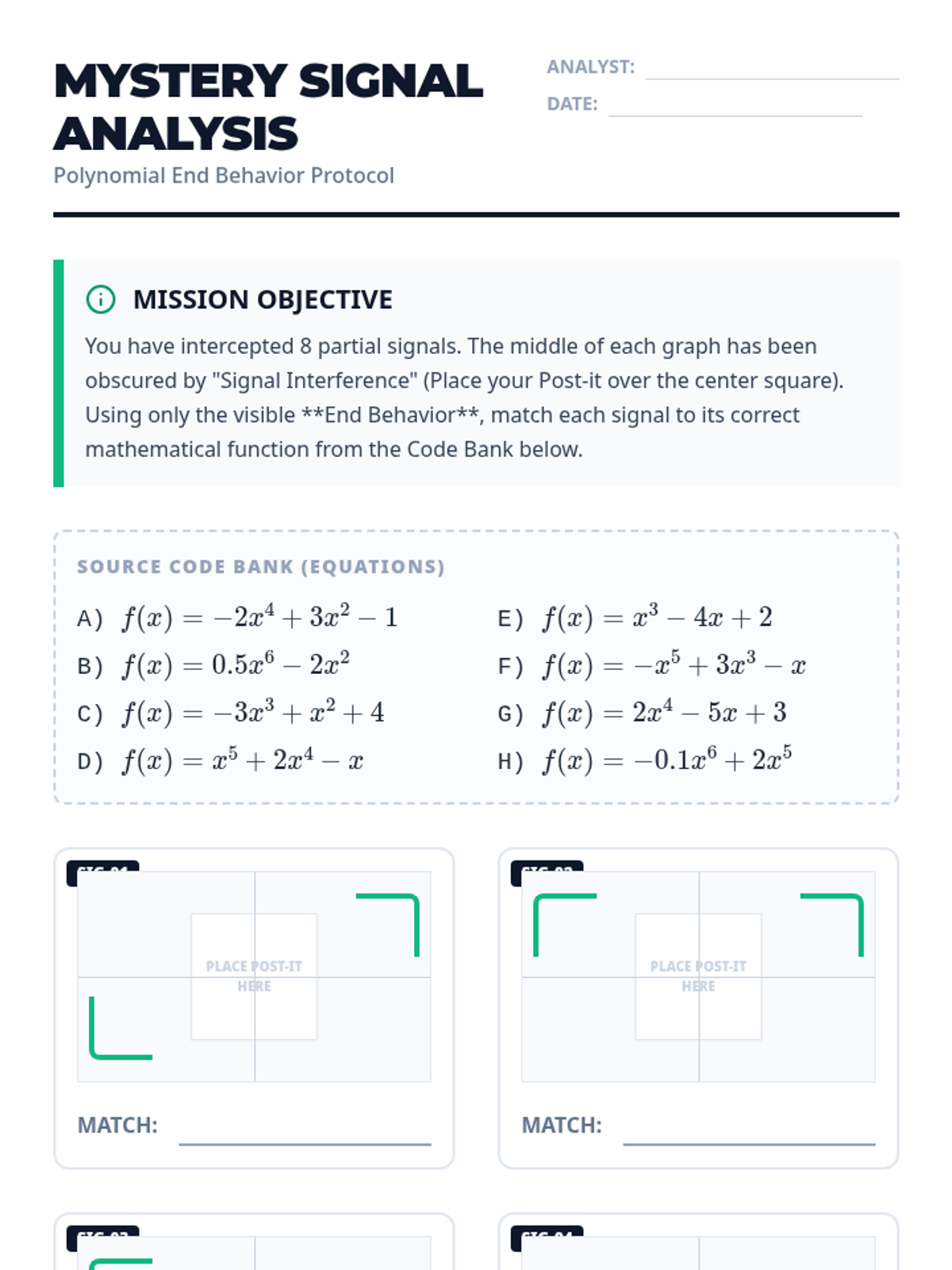 Worksheet for the 'Mystery Signal' activity where students match obscured polynomial graphs to their equations based on end behavior. Includes a reflection section on non-standard form polynomials.