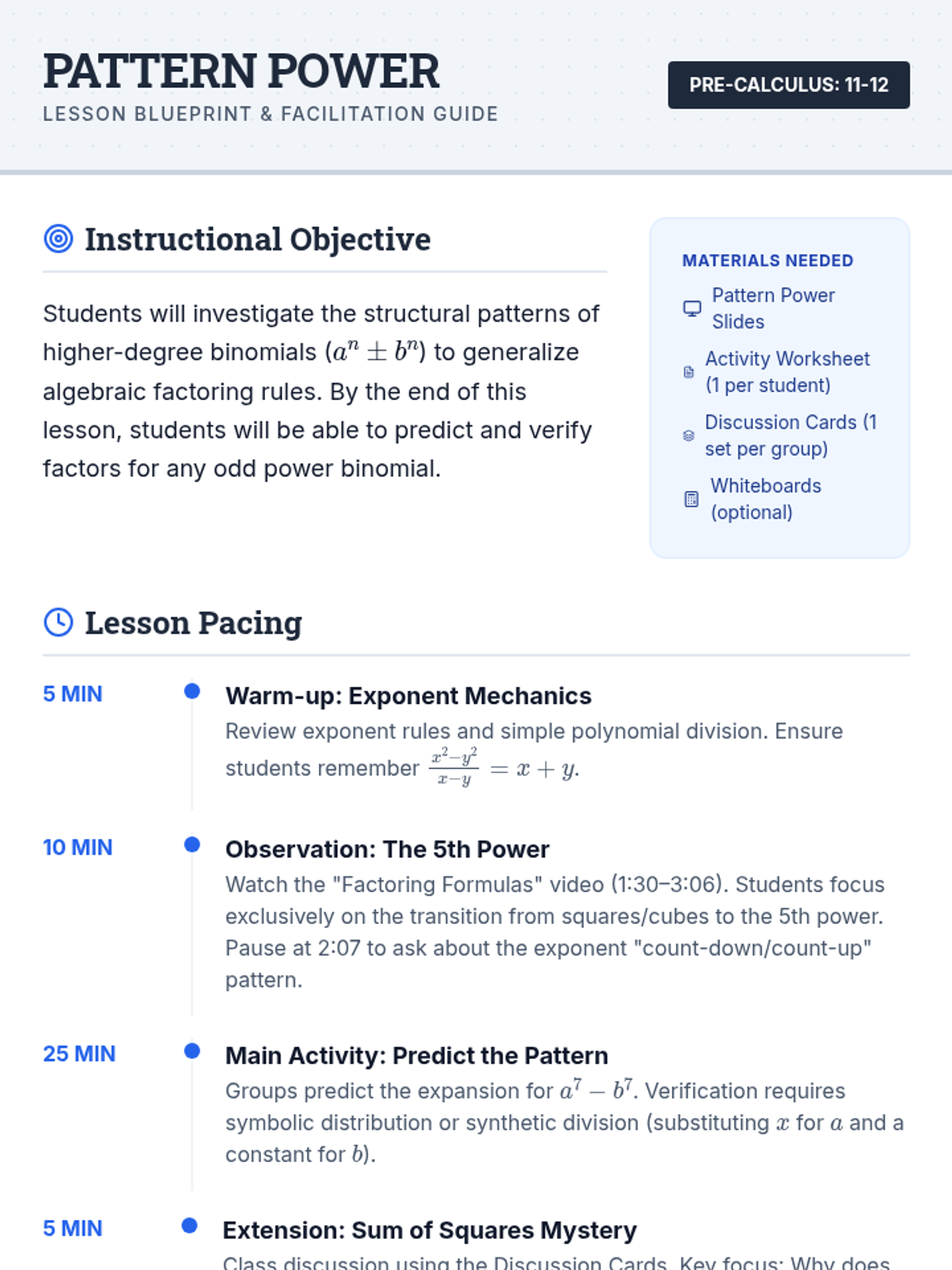 A pedagogical guide for teachers covering lesson objectives, a detailed minute-by-minute pacing plan, specific video pause points with discussion prompts, and strategies for addressing common student misconceptions.