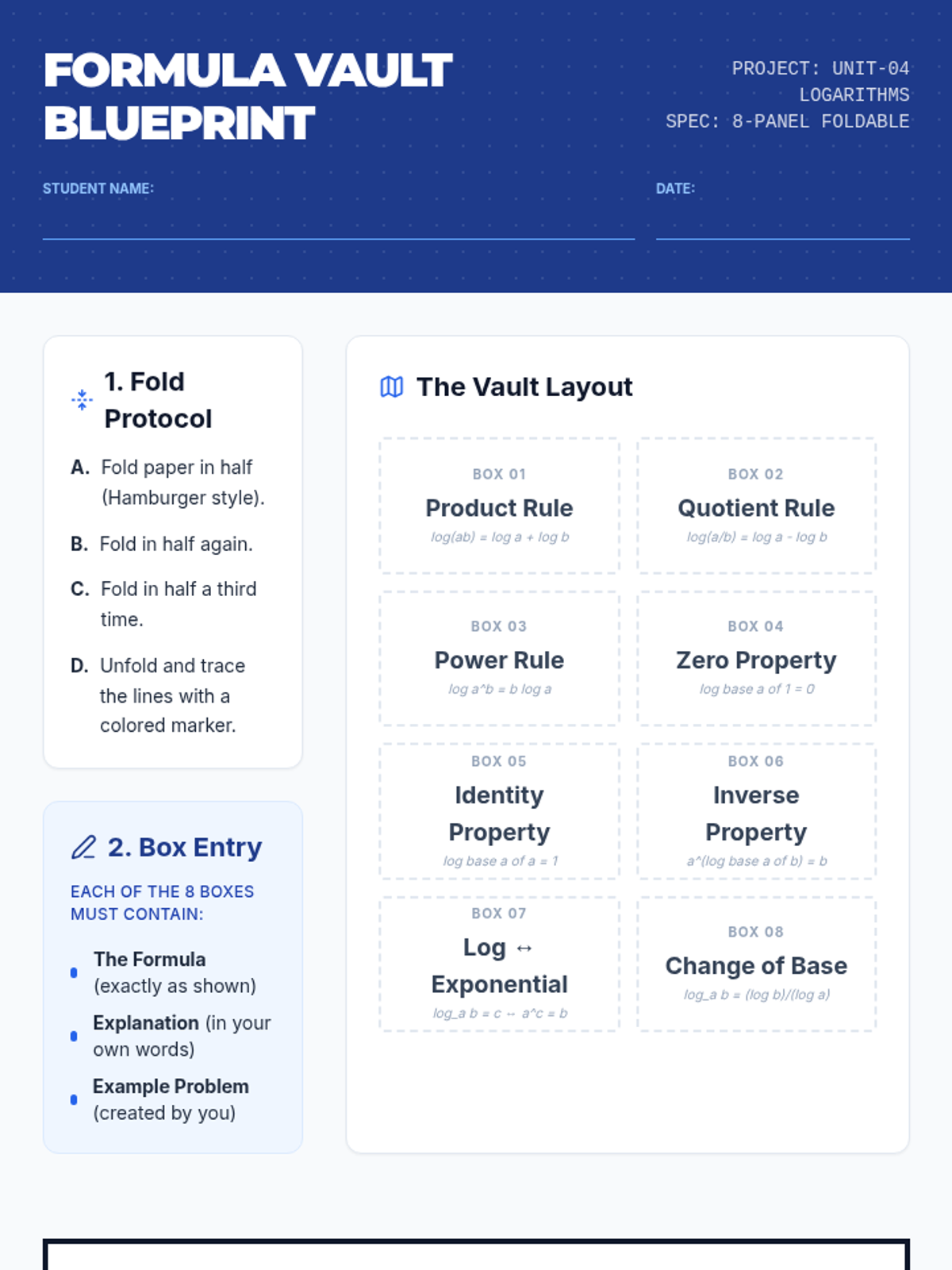 Student activity handout with a 'Blueprint' theme, providing step-by-step folding instructions and a visual roadmap for the 8-panel logarithm formula foldable.