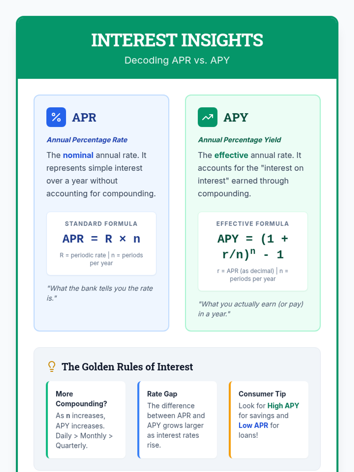 A visually engaging anchor chart for Algebra II students that defines and compares APR and APY, featuring the essential formulas and key financial insights.
