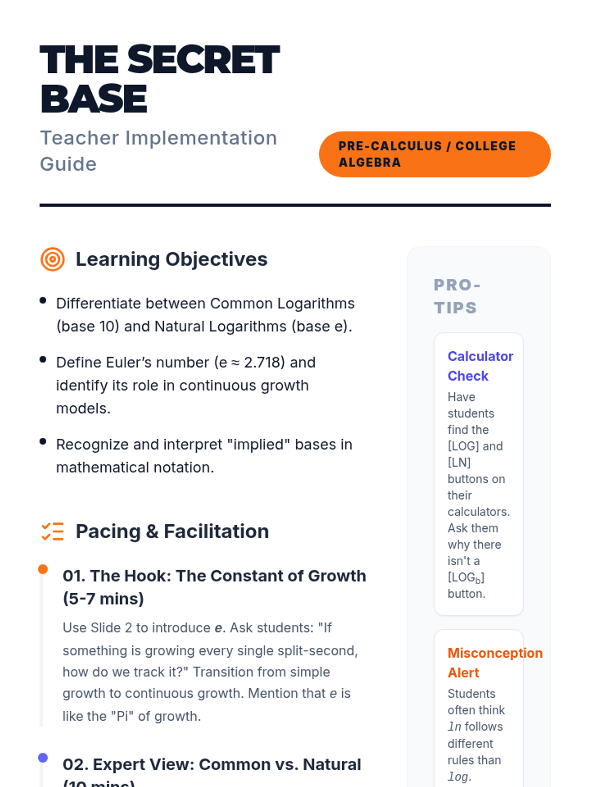 A teacher guide for the 'The Secret Base' lesson, providing instructional strategies, pacing guides, discussion prompts, and facilitation tips for the common vs. natural logarithm lesson.