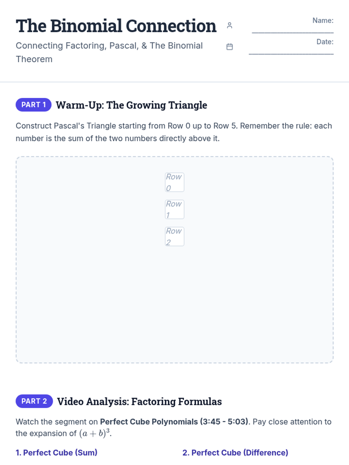 A comprehensive worksheet for 11th-12th grade students exploring the link between Pascal's Triangle, binomial expansion, and factoring formulas. Includes space for drawing the triangle, video observations, and high-level expansion challenges.
