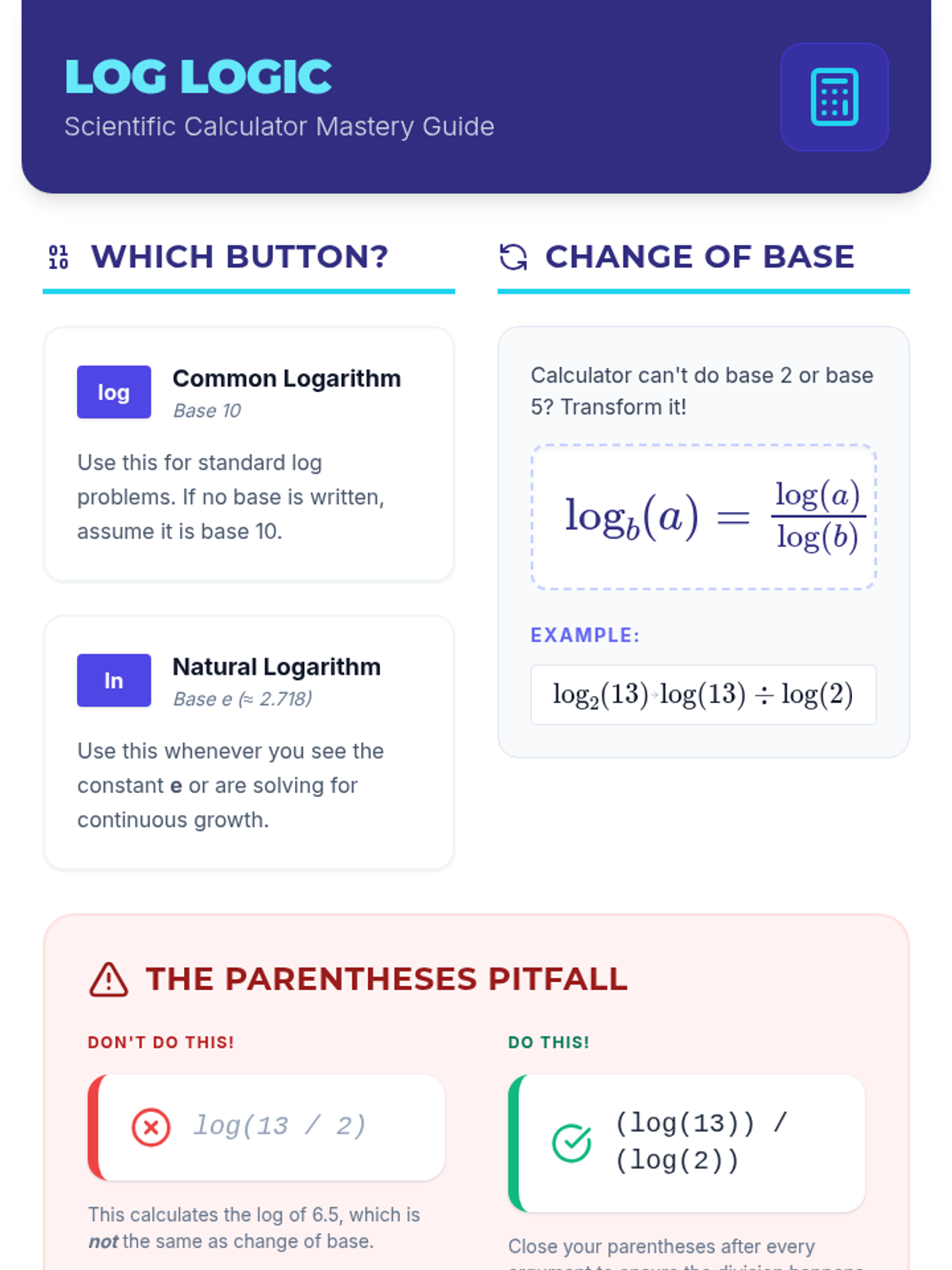 A student reference sheet explaining the difference between common and natural logarithms, the change of base rule, and calculator syntax.