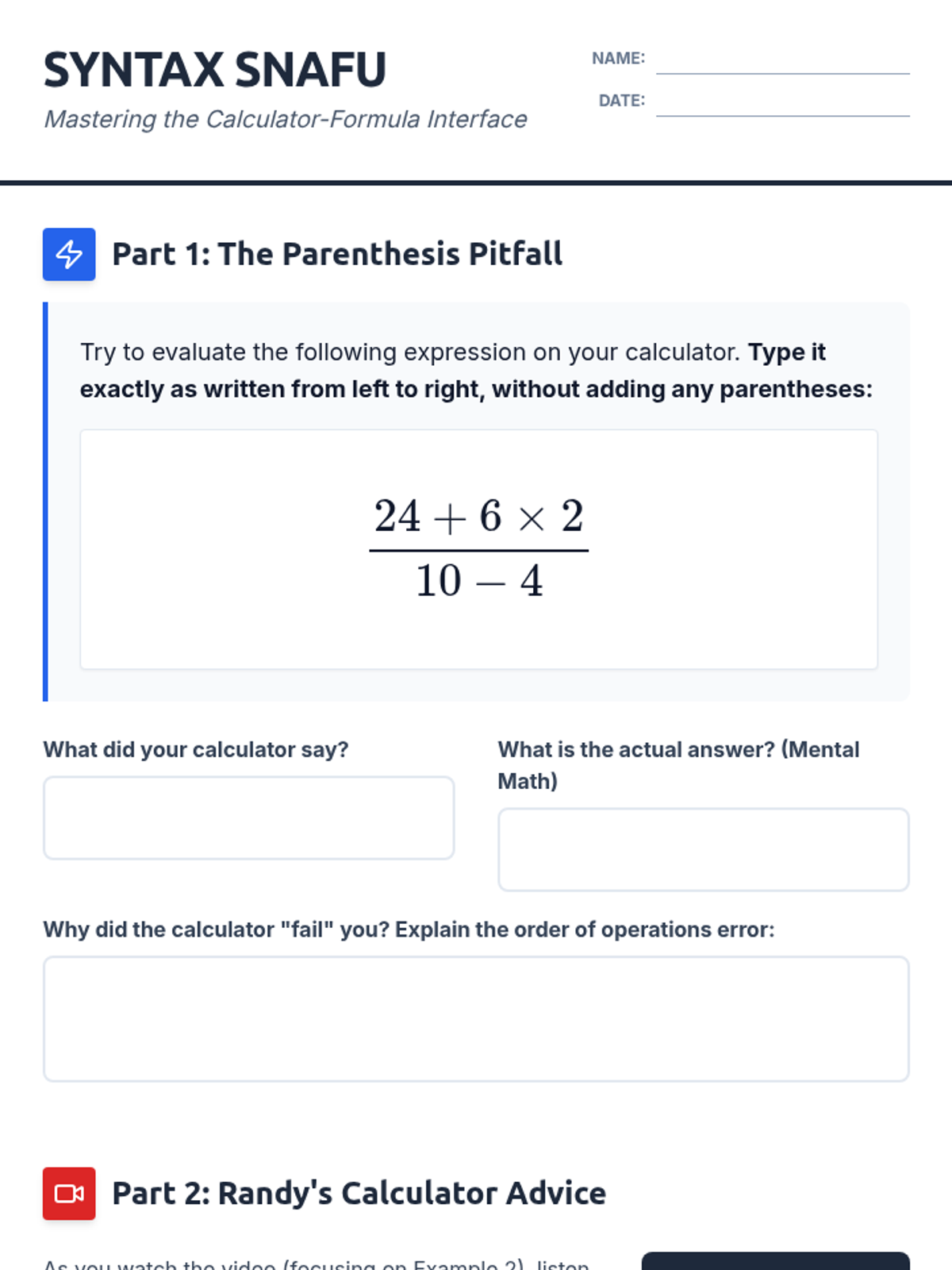A comprehensive student worksheet focusing on calculator syntax errors, featuring a 'Parenthesis Pitfall' hook, video viewing notes for Randy's Geometric Series tutorial, and a 'Syntax Challenge' where students map out precise keystrokes.