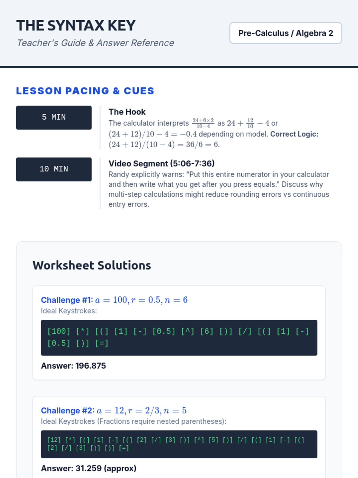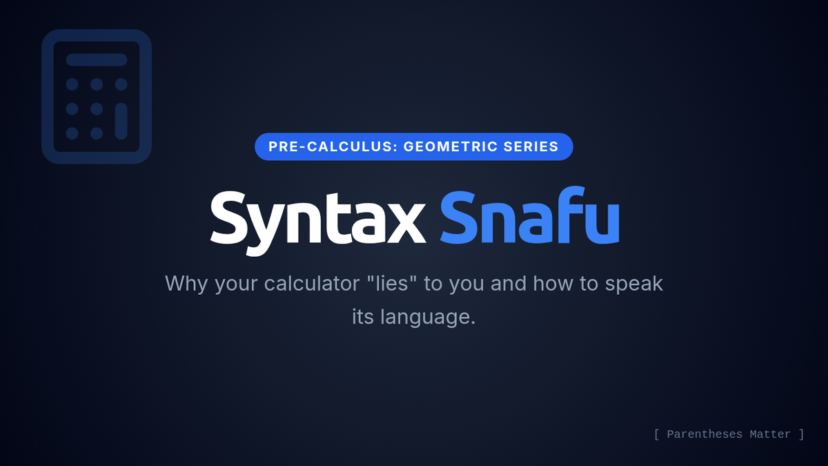 A visual presentation for a Pre-Calculus lesson on calculator syntax and geometric series. Includes a high-impact 'Hook' slide, embedded video focusing on Randy's calculator advice, and a deep-dive into the 'Syntax Red Flags' of the sum formula.