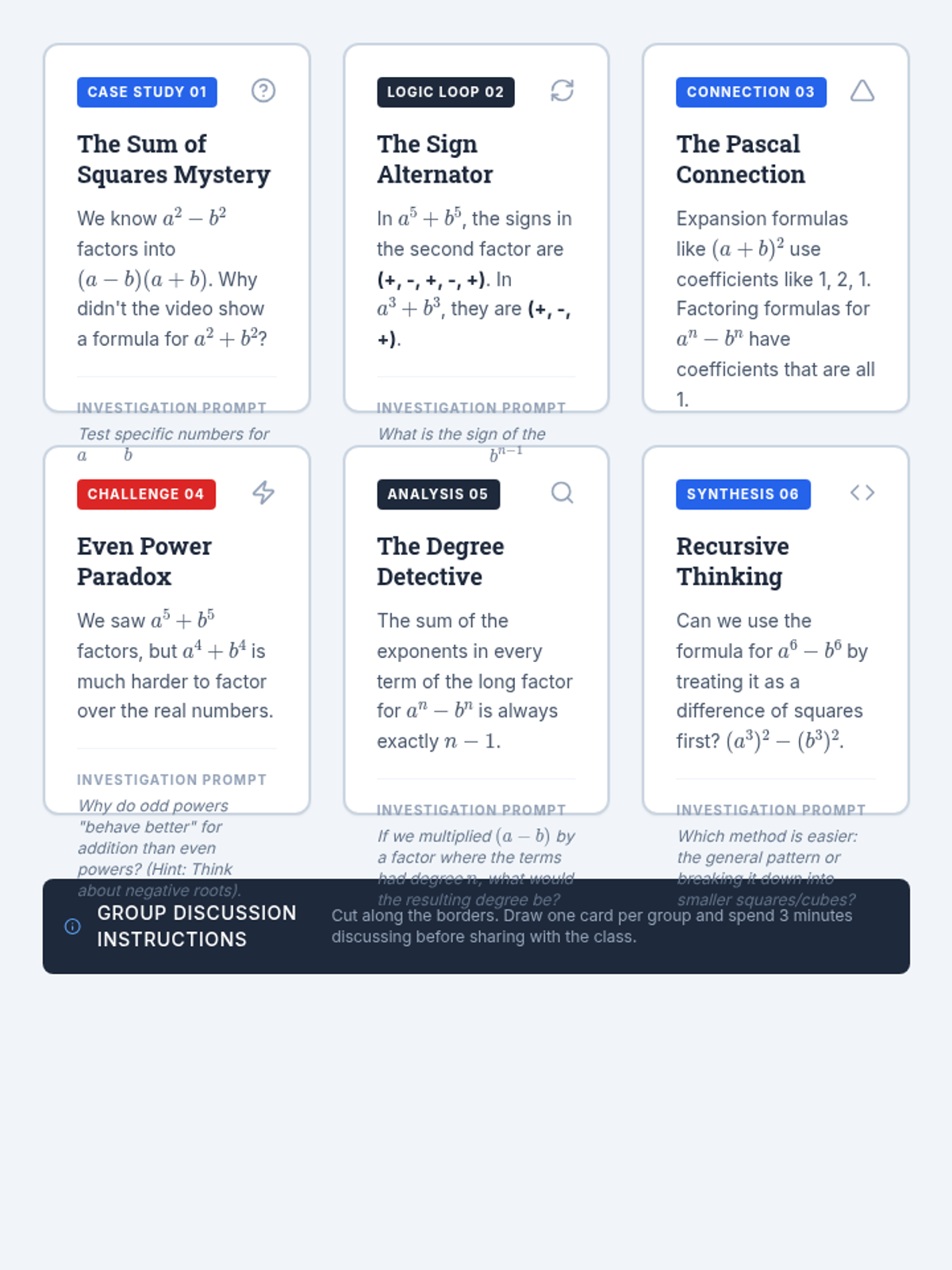 A set of 6 discussion cards for students to explore deeper concepts related to binomial factoring, including the "Sum of Squares Mystery" and "Even Power Paradox." Designed for group work and class discussion.