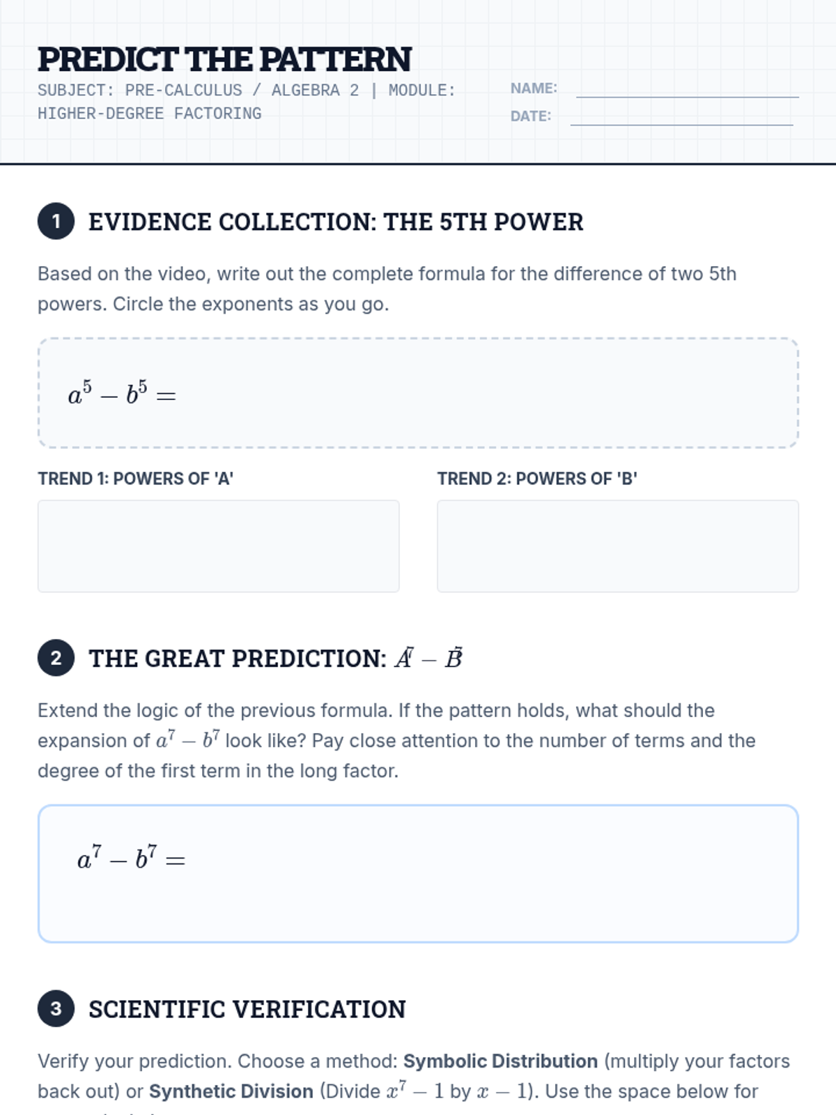 A visual presentation for the Pattern Power lesson, featuring warm-up exercises, an embedded video section, and prompts for group investigation into higher-degree binomial factoring.