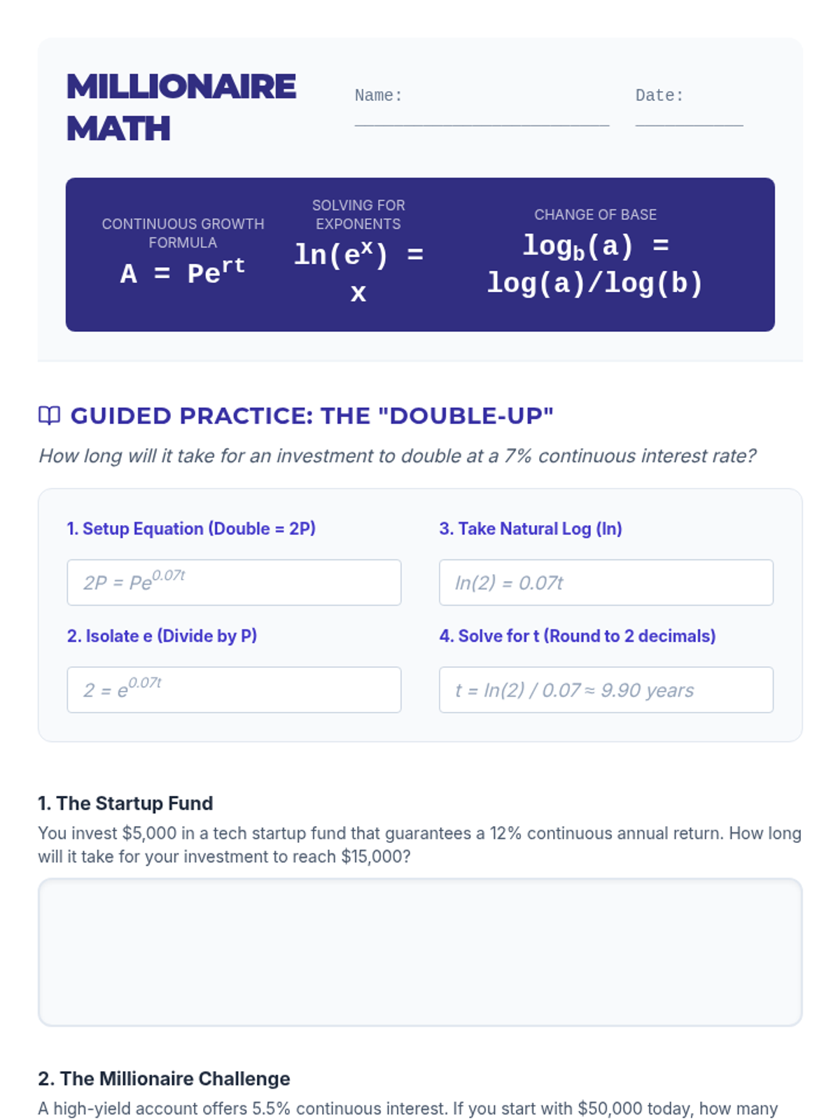 A worksheet for students to practice solving exponential growth and decay problems using natural logarithms and the continuous compounding formula.