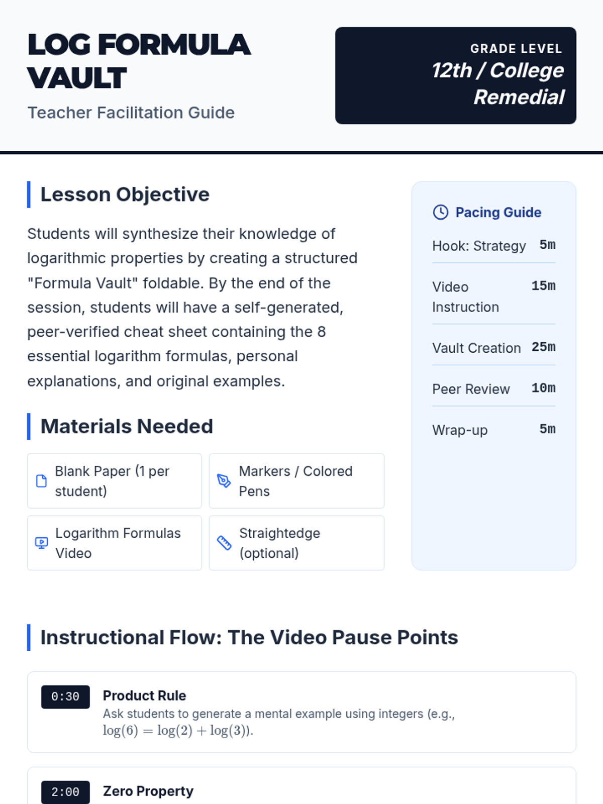 Teacher facilitation guide for the Log Formula Vault lesson, featuring video pause points, common misconceptions, and a structured pacing guide for a 12th-grade or remedial college math class.