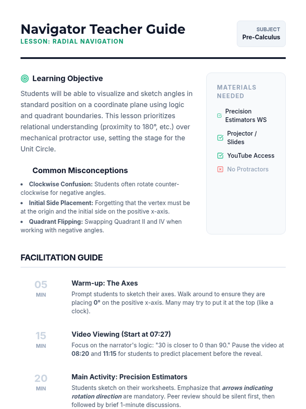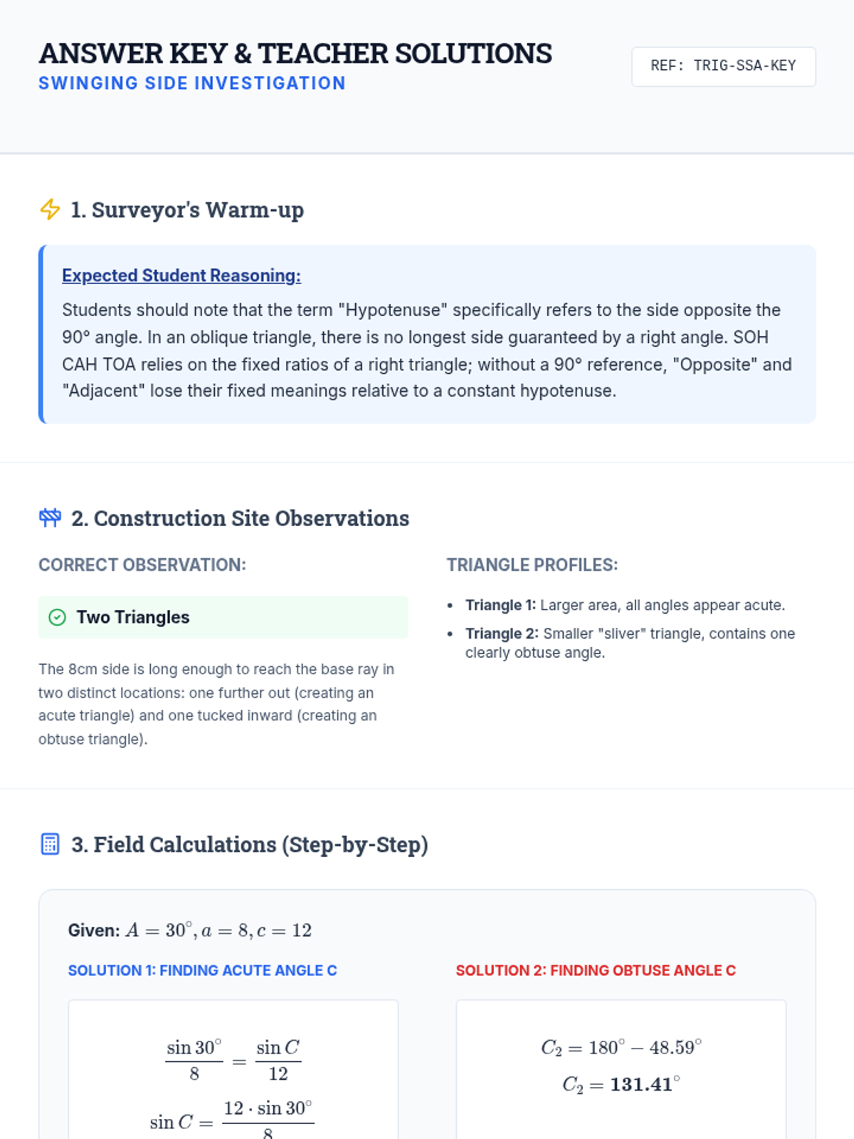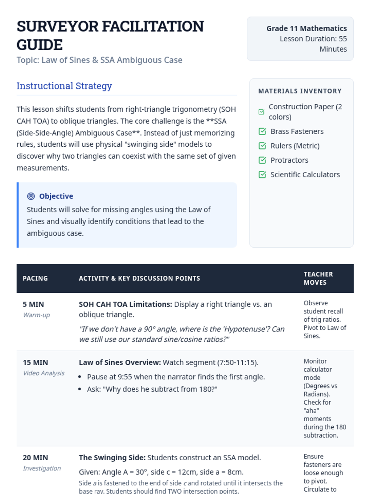 A comprehensive facilitation guide for teachers, outlining the lesson pacing, key discussion questions, materials needed, and common student misconceptions regarding the Law of Sines and the Ambiguous Case.