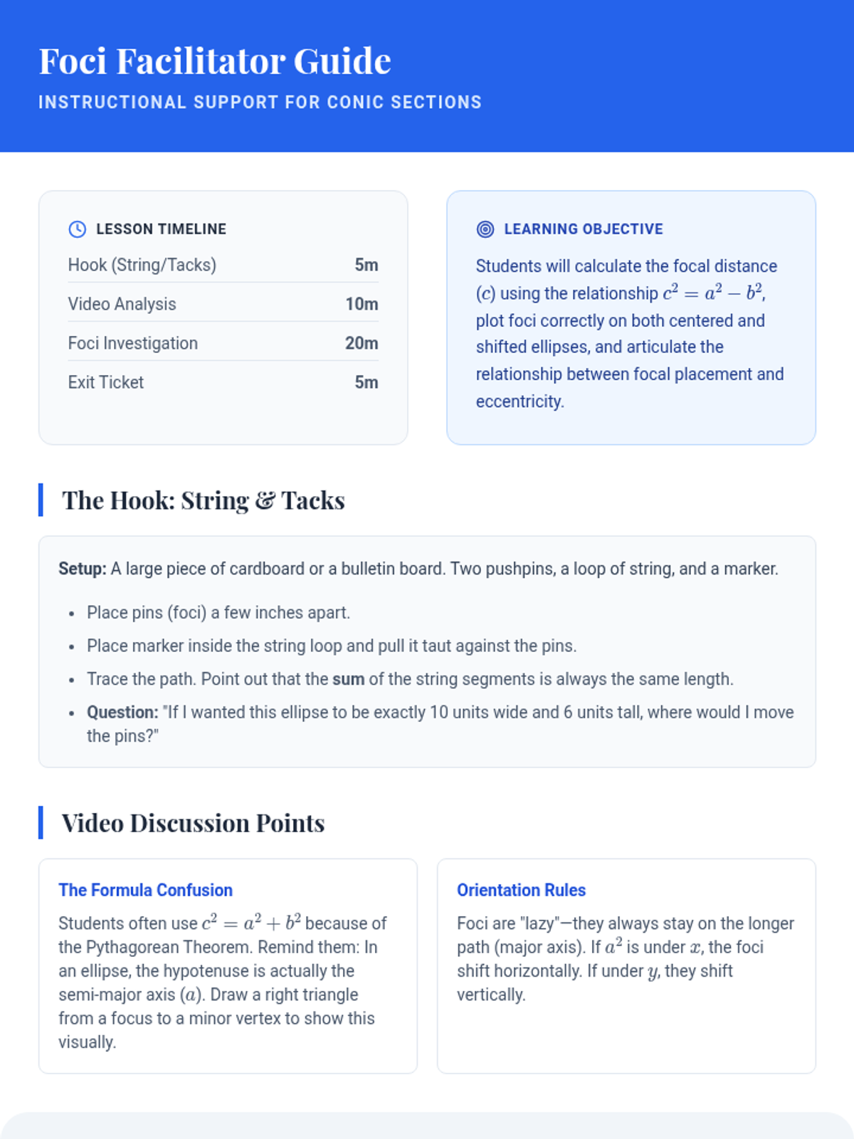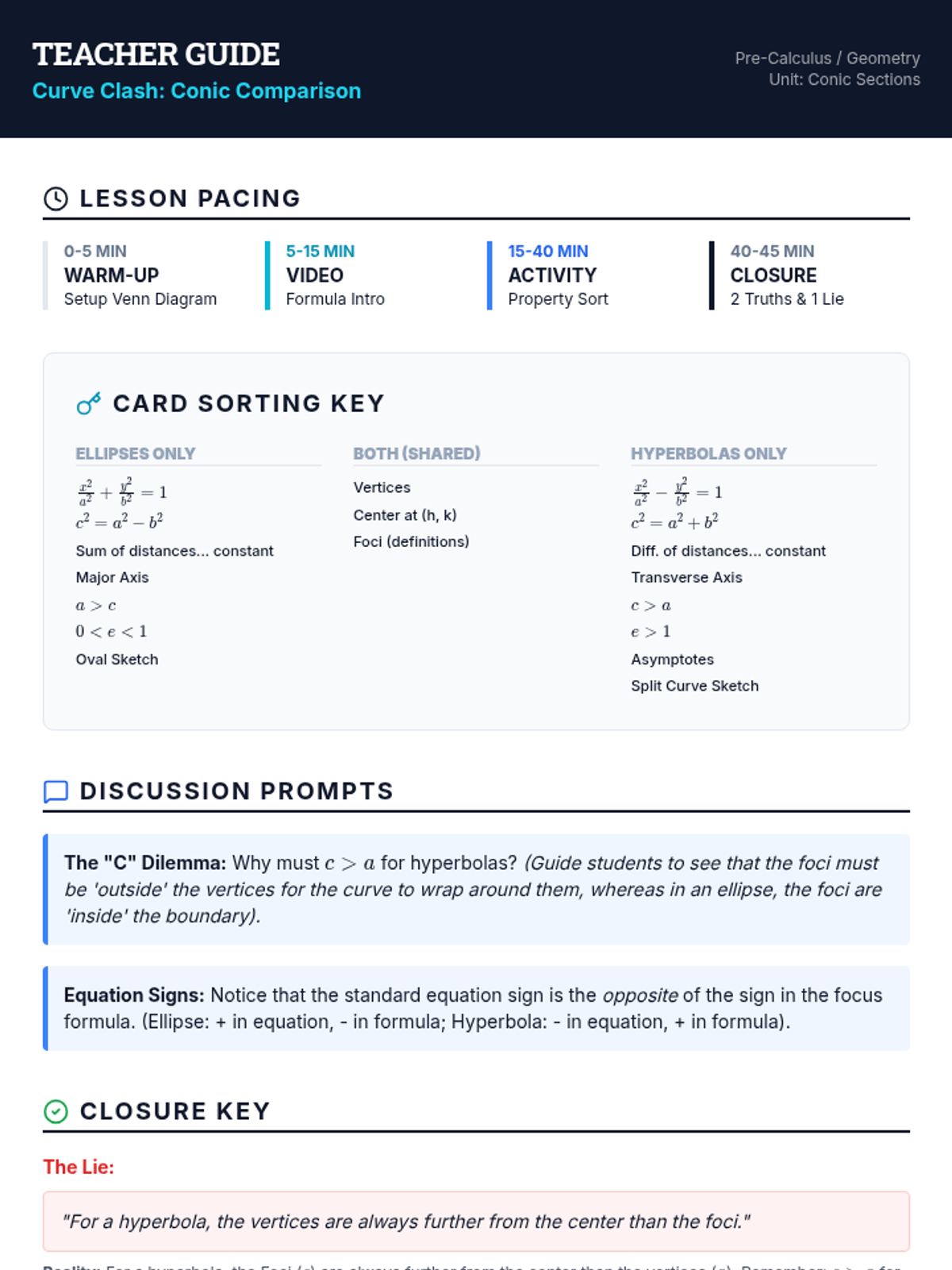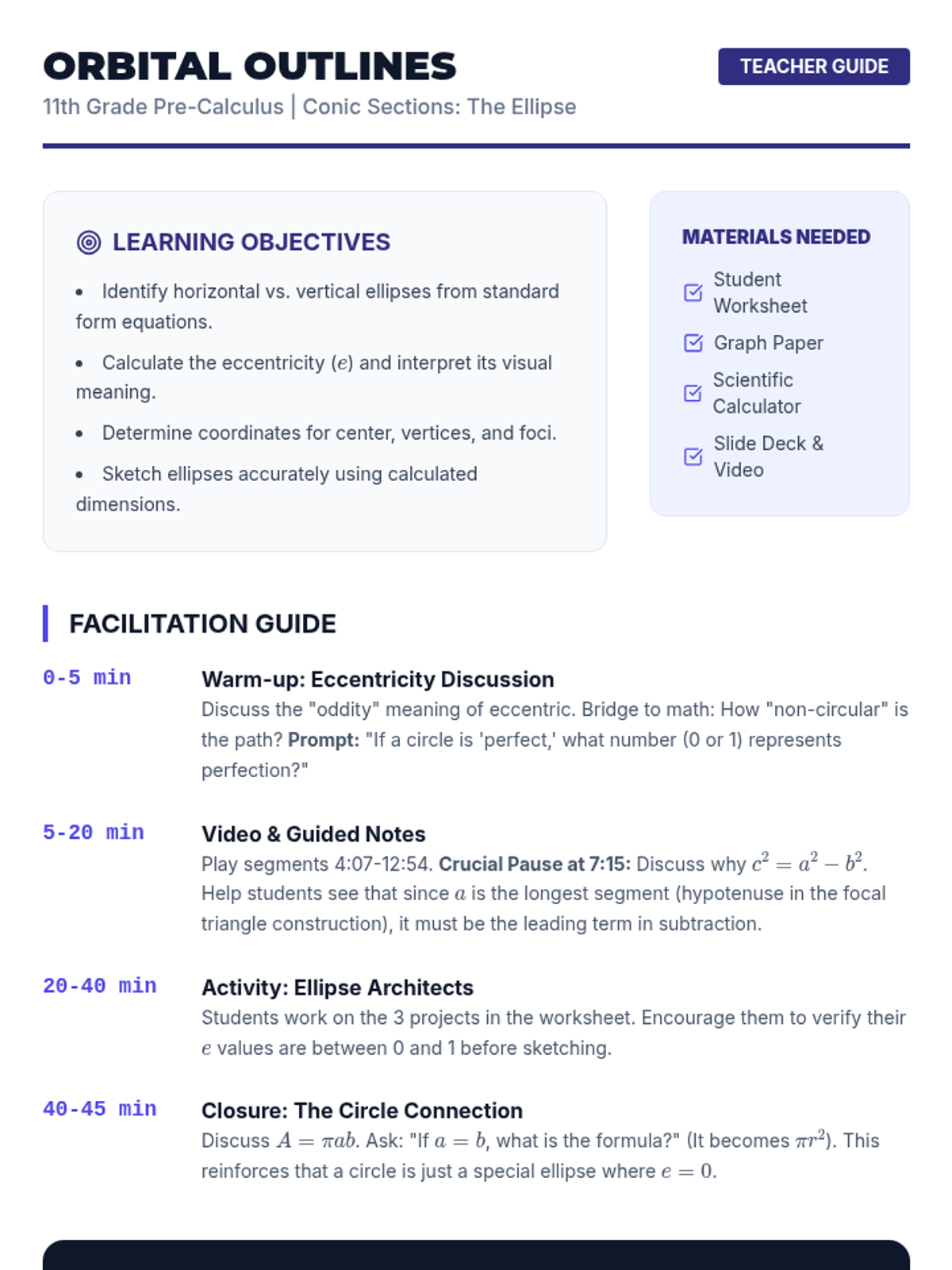 A comprehensive facilitation guide for teachers, outlining the lesson pacing, key discussion questions, materials needed, and common student misconceptions regarding the Law of Sines and the Ambiguous Case.
