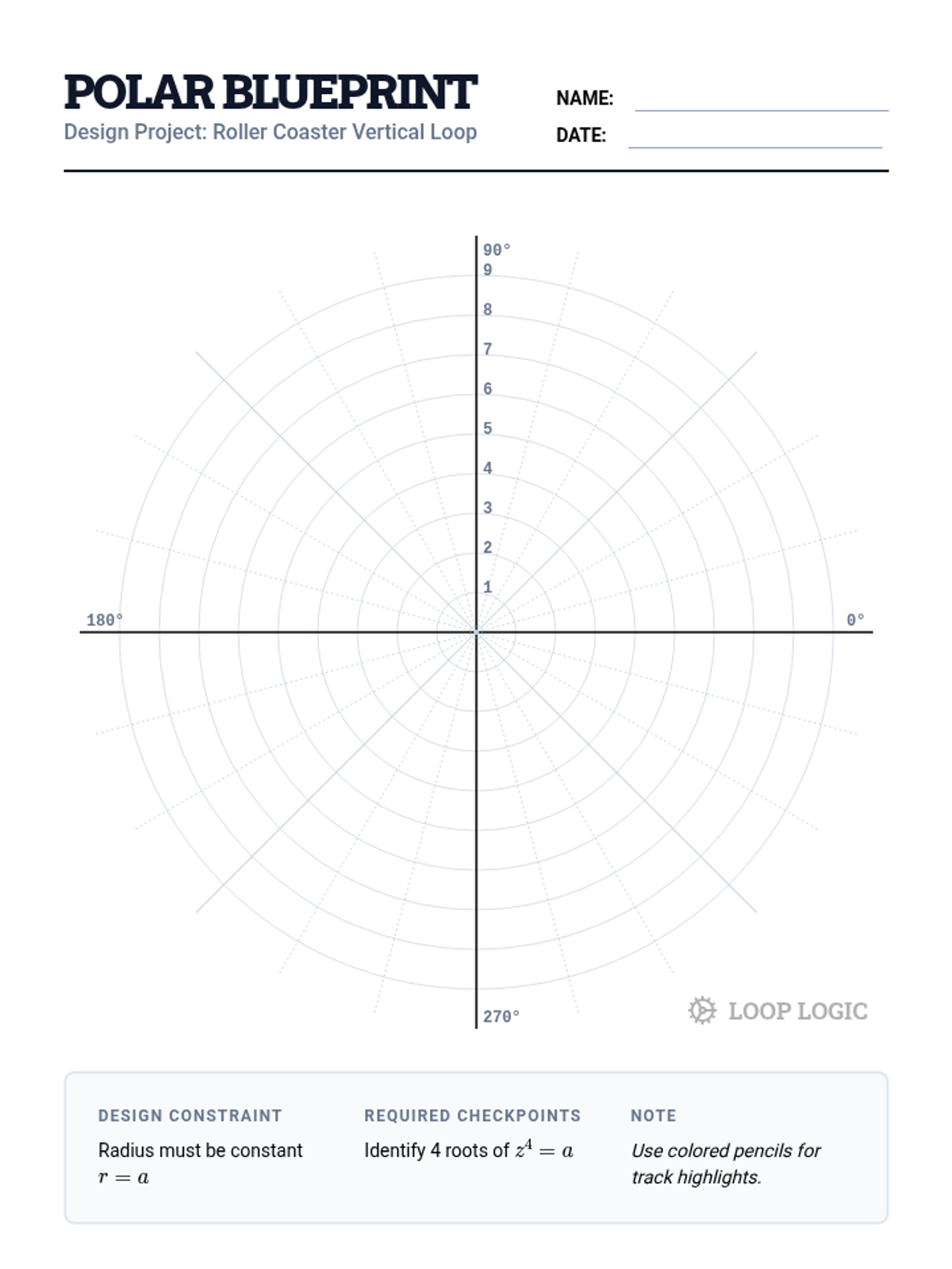 A technical polar coordinate grid designed for student coaster designs. Includes concentric circles, degree markings, and a professional engineering blueprint aesthetic.