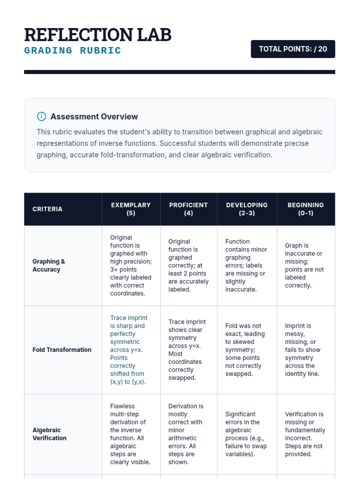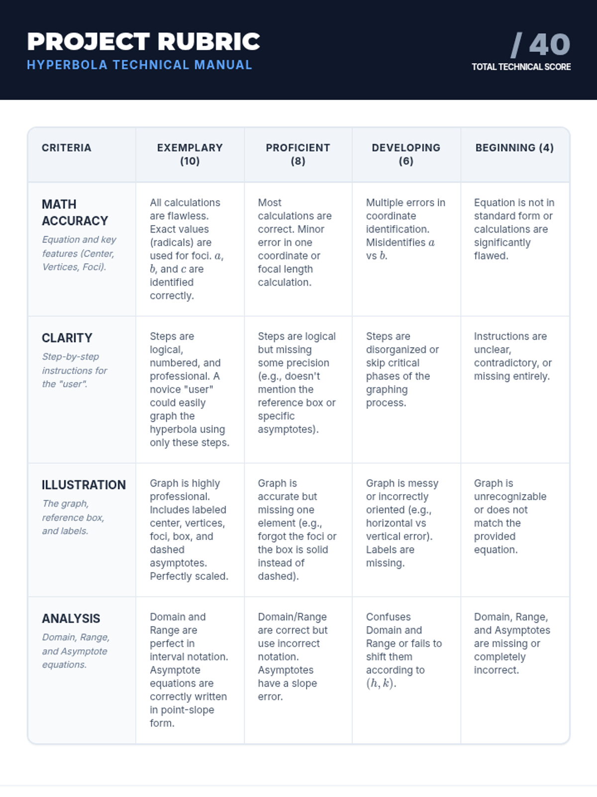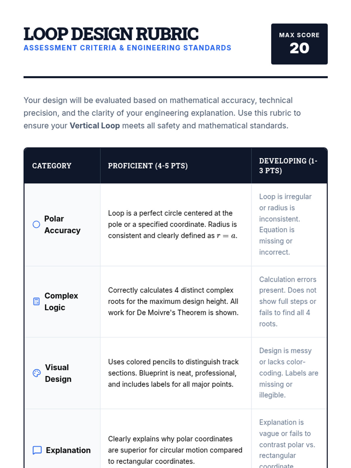 A comprehensive assessment rubric for the Roller Coaster Loop Design project. Evaluates polar accuracy, complex number calculations, visual design, and conceptual explanation.